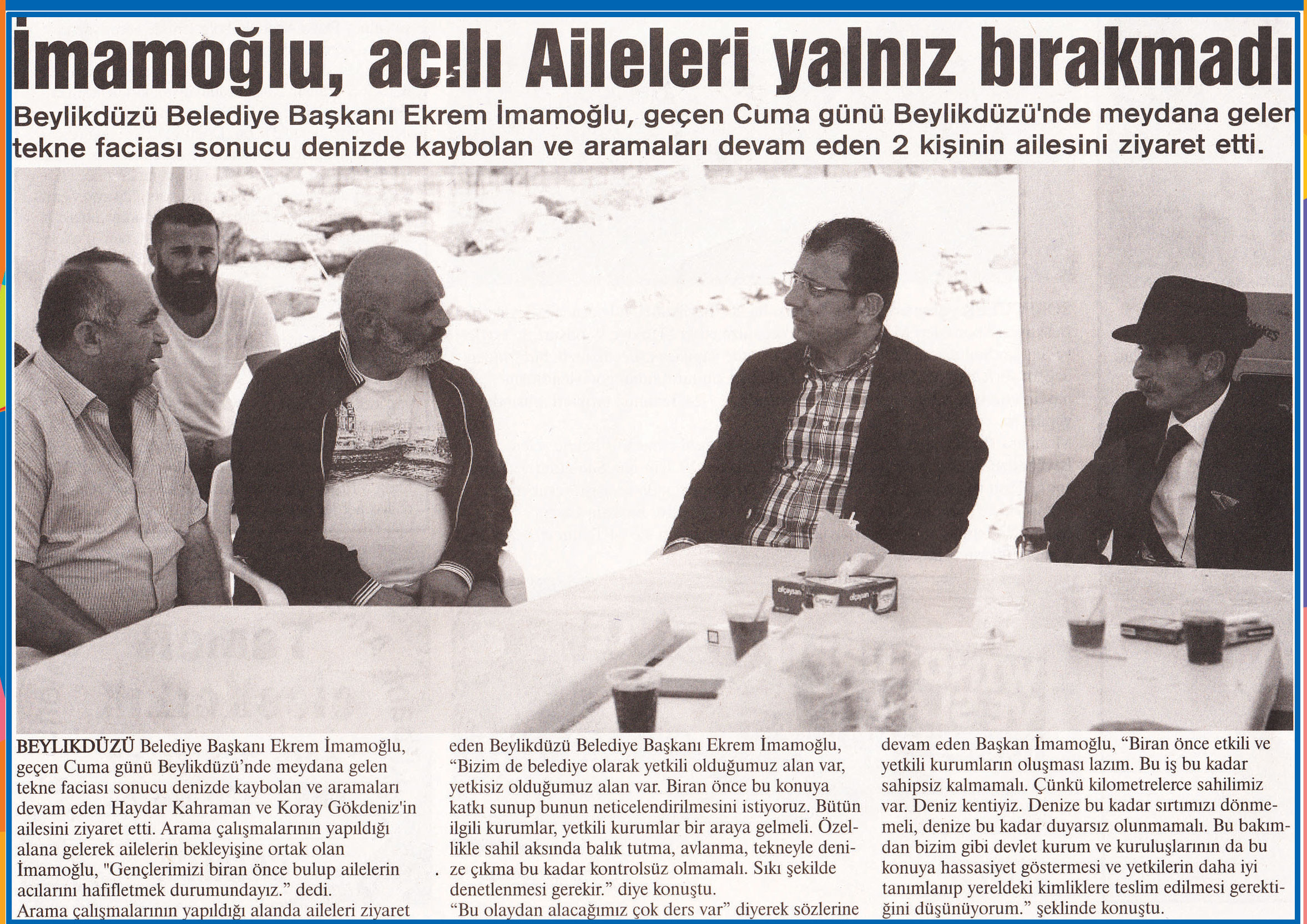 13 Temmuz 2016 tarihli "MARMARA HABER" gazetesi. Beylikdüzü Belediye Başkanı Ekrem İmamoğlu, geçen Cuma günü Beylikdüzü'nde meydana gelen tekne faciası sonucu denizde kaybolan ve aramaları devam eden 2 kişinin ailesini ziyaret etti.