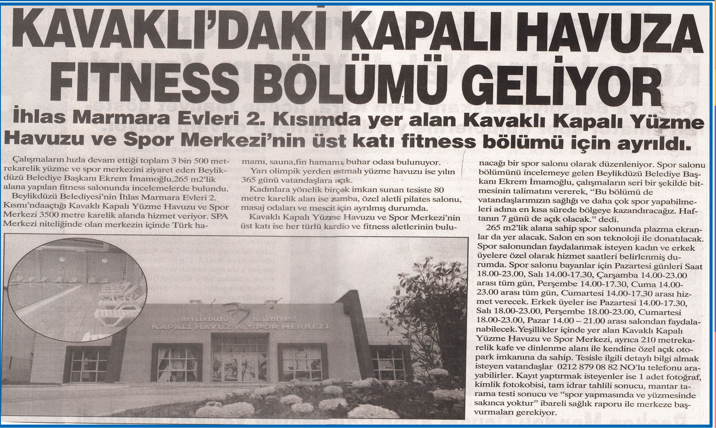 15 Temmuz 2016 tarihli "YURT HABER" gazetesi. İhlas Marmara Evleri 2. Kısımda yer alan Kavaklı Kapalı Yüzme Havuzu ve Spor Merkezi'nin üst katı fitness bölümü için ayrıldı.