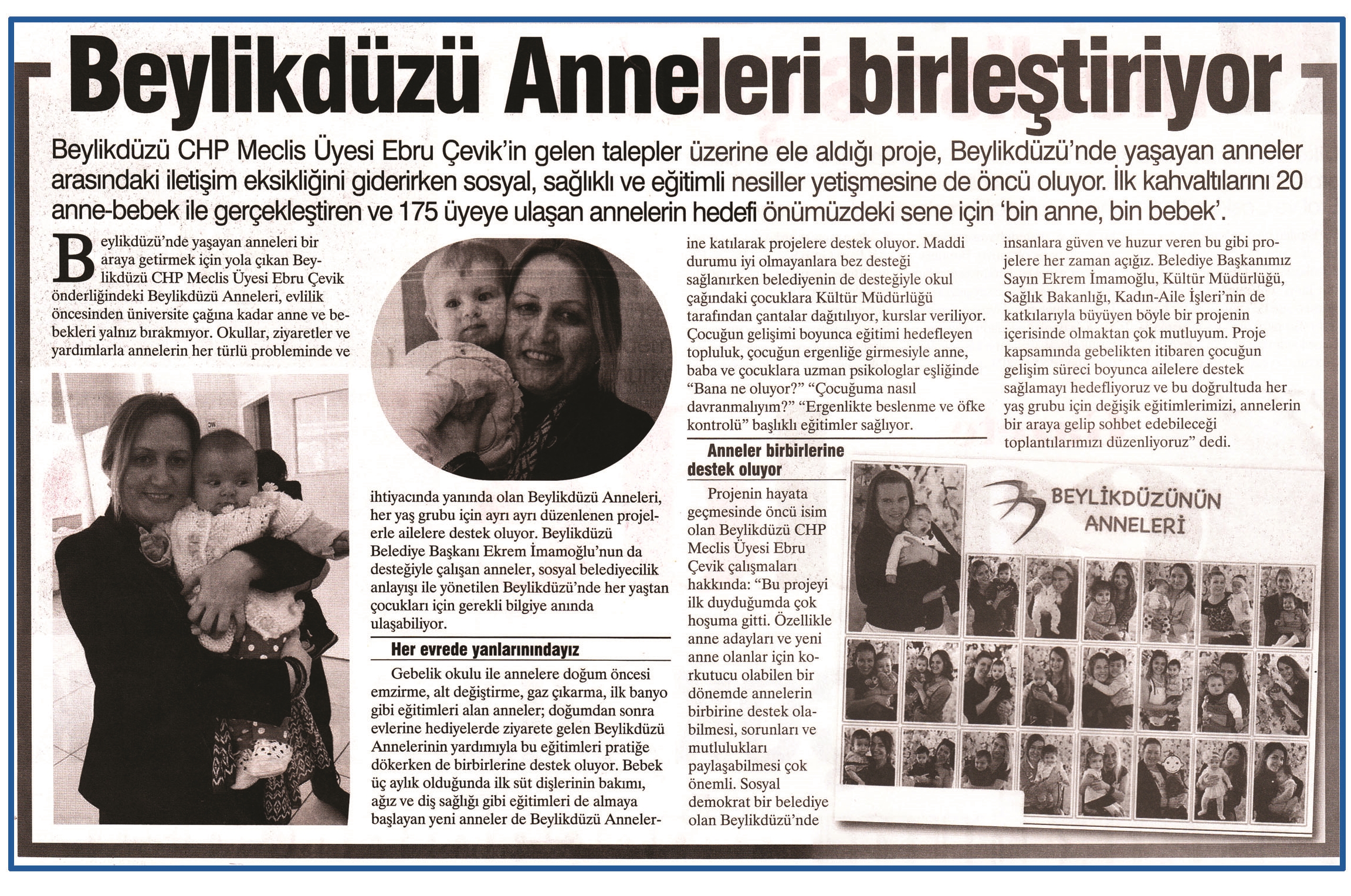14 Haziran 2016 tarihli " GAZETE CADDE" gazetesi. Beylikdüzü'nde yaşayan anneleri bir araya getirmek için yola çıkan CHP Meclis Üyesi Ebru Çevik önderliğindeki Beylikdüzü Anneleri, evlilik öncesinden üniversite çağına kadar anne ve bebekleri yalnız bırakmıyor. İlk kahvaltılarını 20 anne ile gerçekleştiren, 175 üyeye ulaşan annelerin hedefi önümüzdeki sene için " bin anne, bin bebek"...