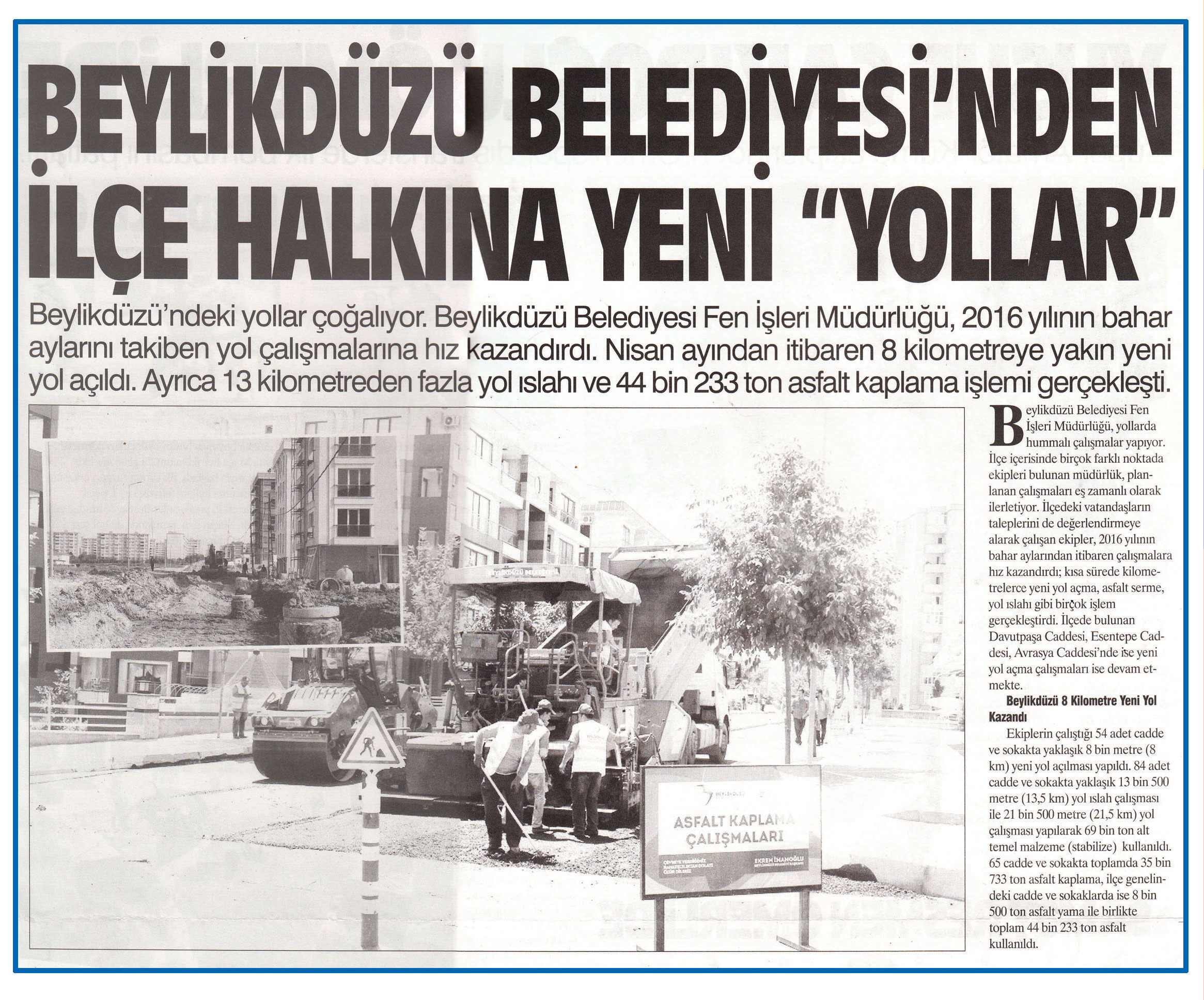 4 Ağustos 2016 tarihli ''HABERCİ'' gazetesi. Beylikdüzü'ndeki yollar çoğalıyor. Beylikdüzü Belediyesi Fen İşleri Müdürlüğü,2016 yılının bahar aylarını takiben yol çalışmalarına hız kazandırdı.