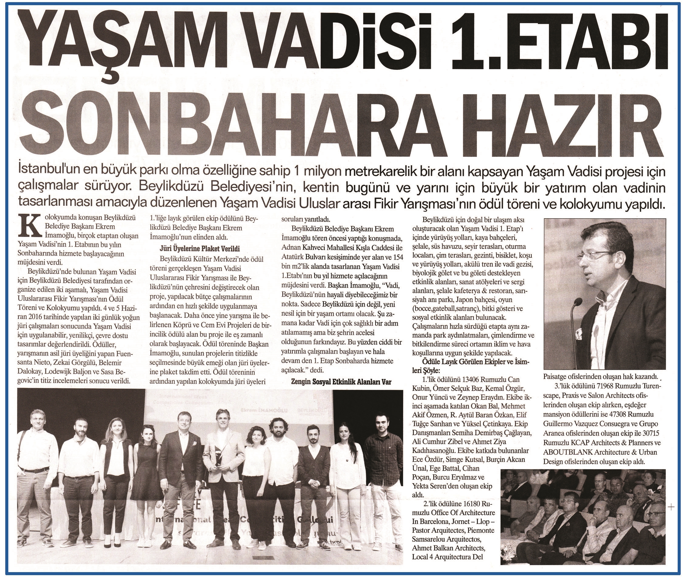 15 Haziran 2016 tarihli " HABERCİ" gazetesi. İstanbul'un en büyük parkı olma özelliğine sahip 1 milyon metrekarelik bir alanı kapsayan Yaşam Vadisi projesi için çalışmalar sürüyor. Beylikdüzü Belediyesi'nin kentin bugünü ve yarını için büyük bir yatırım olan vadinin tasarlanması amacıyla düzenlenen Yaşam Vadisi Uluslararası Fikir Yarışması'nın ödül töreni ve kolokyumu yapıldı.