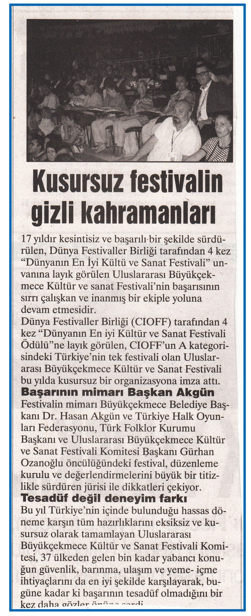 9 Ağustos 2016 tarihli ''BÜYÜKÇEKMECE'' gazetesi. 17 yıldır kesintisiz ve başarılı bir şekilde sürdürülen,Dünya Festivaller Birliği tarafından 4 kez ''Dünyanın En İyi Kültür ve Sanat Festivali'' ünvanına layık görülen Uluslarası Büyükçekmece Kültür ve Sanat Festivali'nin başarısının sırrı çalışkan ve inanmış bir ekiple yoluna devam etmesidir.