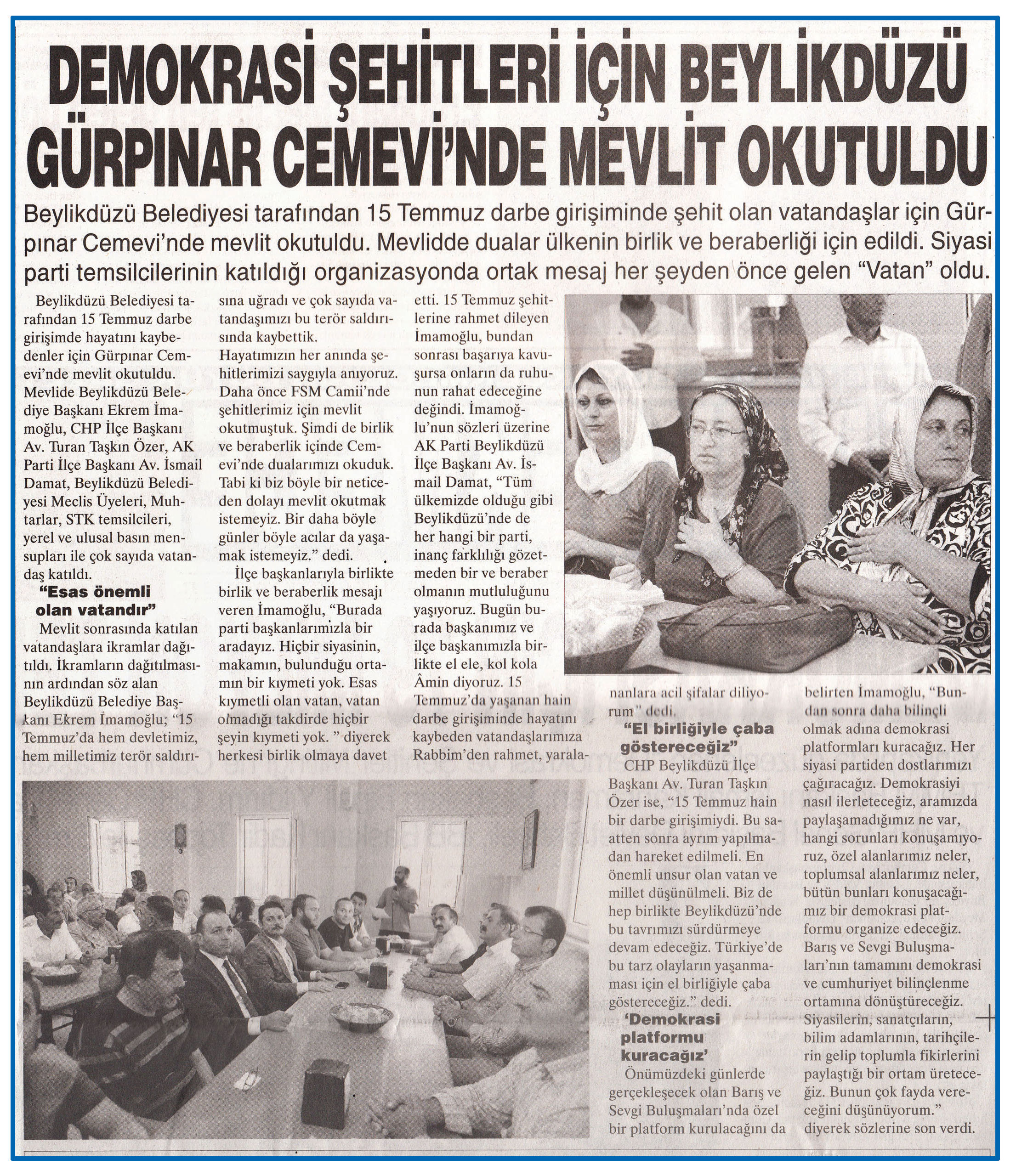 9 Ağustos 2016 tarihli ''BÜYÜKÇEKMECE'' gazetesi. Beylikdüzü Belediyesi tarafından 15 Temmuz darbe girişiminde şehit olan vatandaşlar için Gürpınar Cemevi'nde mevlit okutuldu.Mevlidde dualar ülkenin birlik ve beraberliği için edildi.Siyasi parti temsilcilerinin katıldığı organizasyonda ortak mesaj her şeyden önce gelen ''Vatan'' oldu.