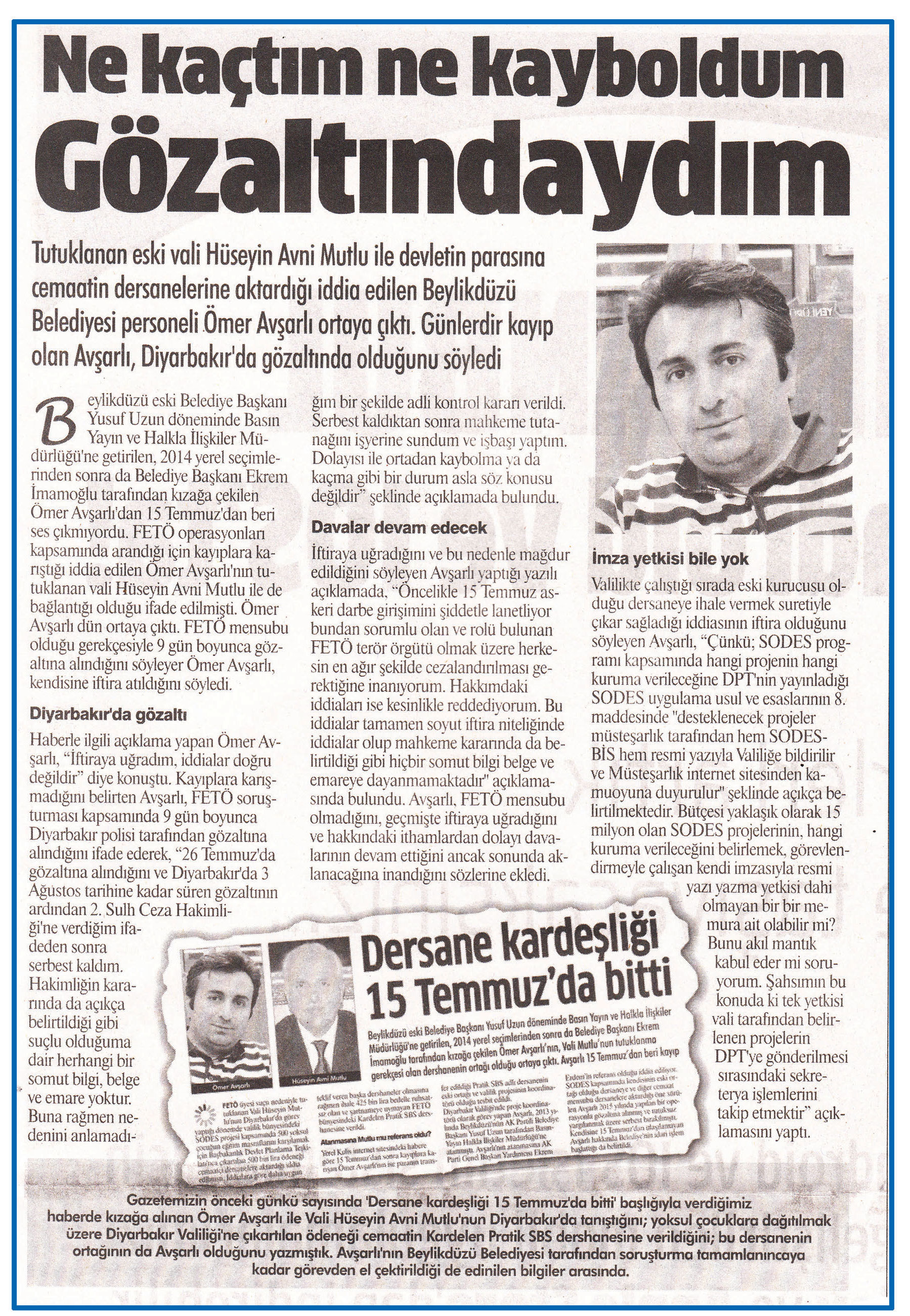 9 Ağustos 2016 tarihli ''GAZETEM İSTANBUL'' gazetesi. Tutuklanan eski vali Hüseyin Avni Mutlu ile devletin parasını cemaatin dershanelerine aktardığı iddia edilen Beylikdüzü Belediyesi personeli Ömer Avşarlı ortaya çıktı.Günlerdir kayıp olan Avşarlı,Diyarbakır'da gözaltında olduğunu söyledi