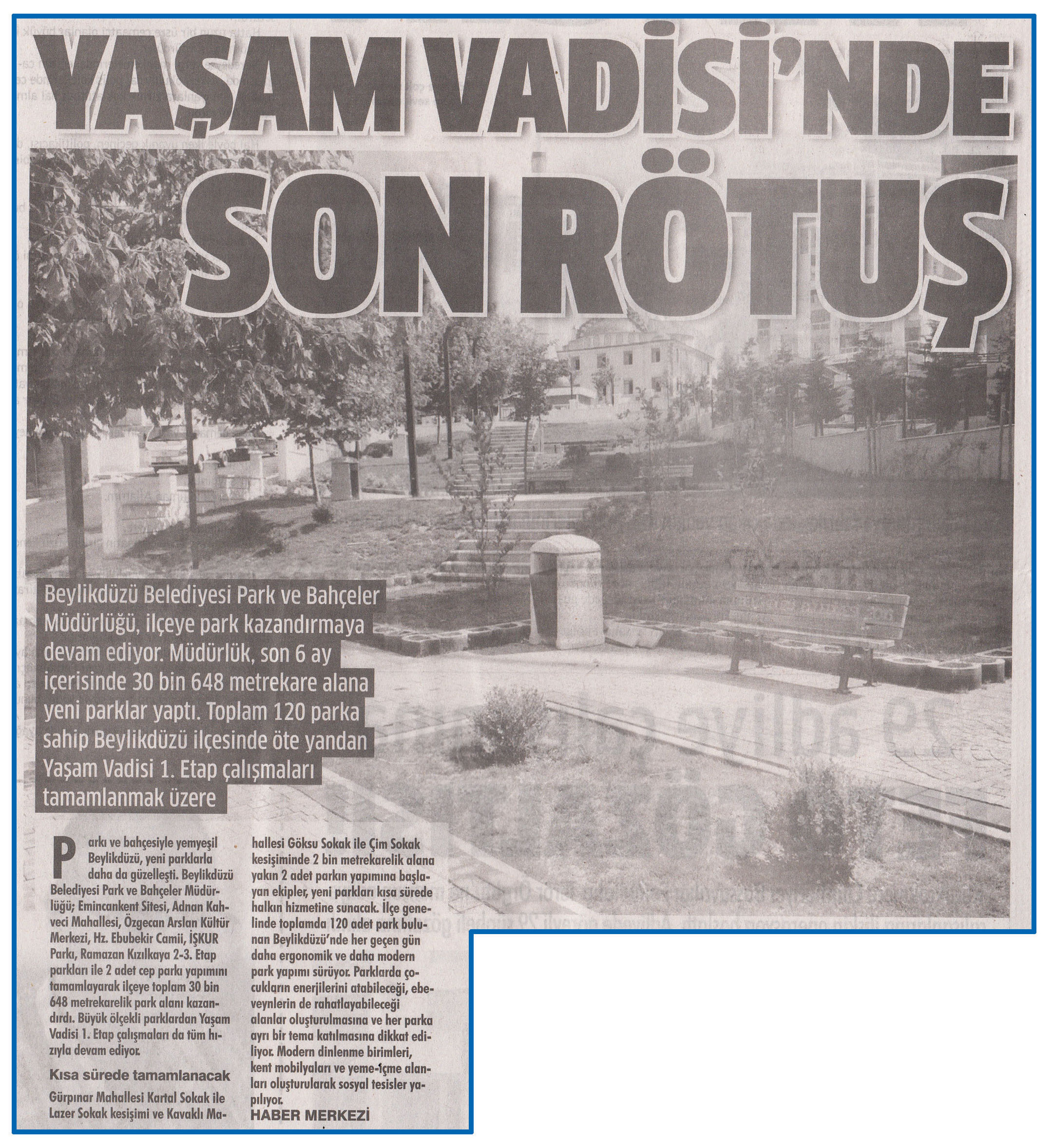 11 Ağustos 2016 tarihli ''GAZETEM İSTANBUL'' gazetesi. Beylikdüzü Belediyesi Park ve Bahçeler Müdürlüğü,İlçeye park kazandırmaya devam ediyor.Müdürlük, son 6 ay içerisinde 30 bin 648 m² alana yeni parklar yaptı. Toplam 120 parka sahip Beylikdüzü ilçesinde öte yandan Yaşam Vadisi 1. Etap çalışmaları tamamlanmak üzere.