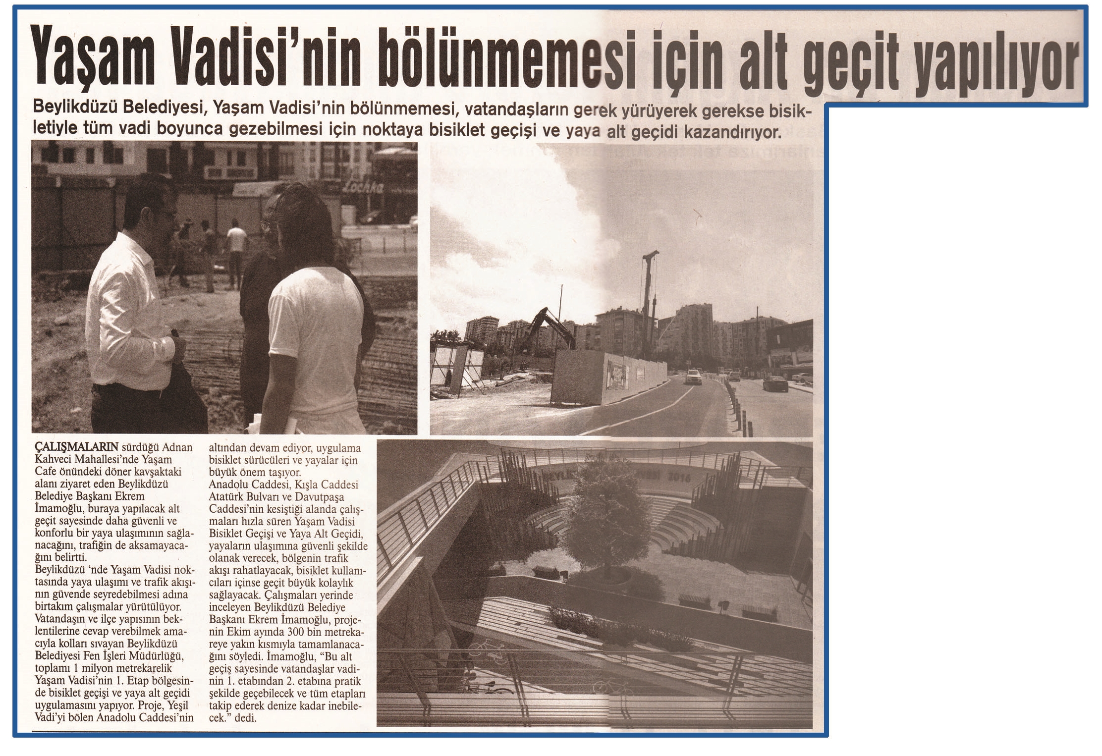 30 Haziran 2016 tarihli "MARMARA" gazetesi. Beylikdüzü Belediyesi, Yaşam Vadisi'nin bölünmemesi, vatandaşların gerek yürüyerek gerekse bisikletiyle tüm vadi boyunca gezebilmesi için, Yaşam Vadisi'nin 1. Etap bölgesine, bisiklet geçişi ve yaya alt geçidi uygulamasını yapıyor