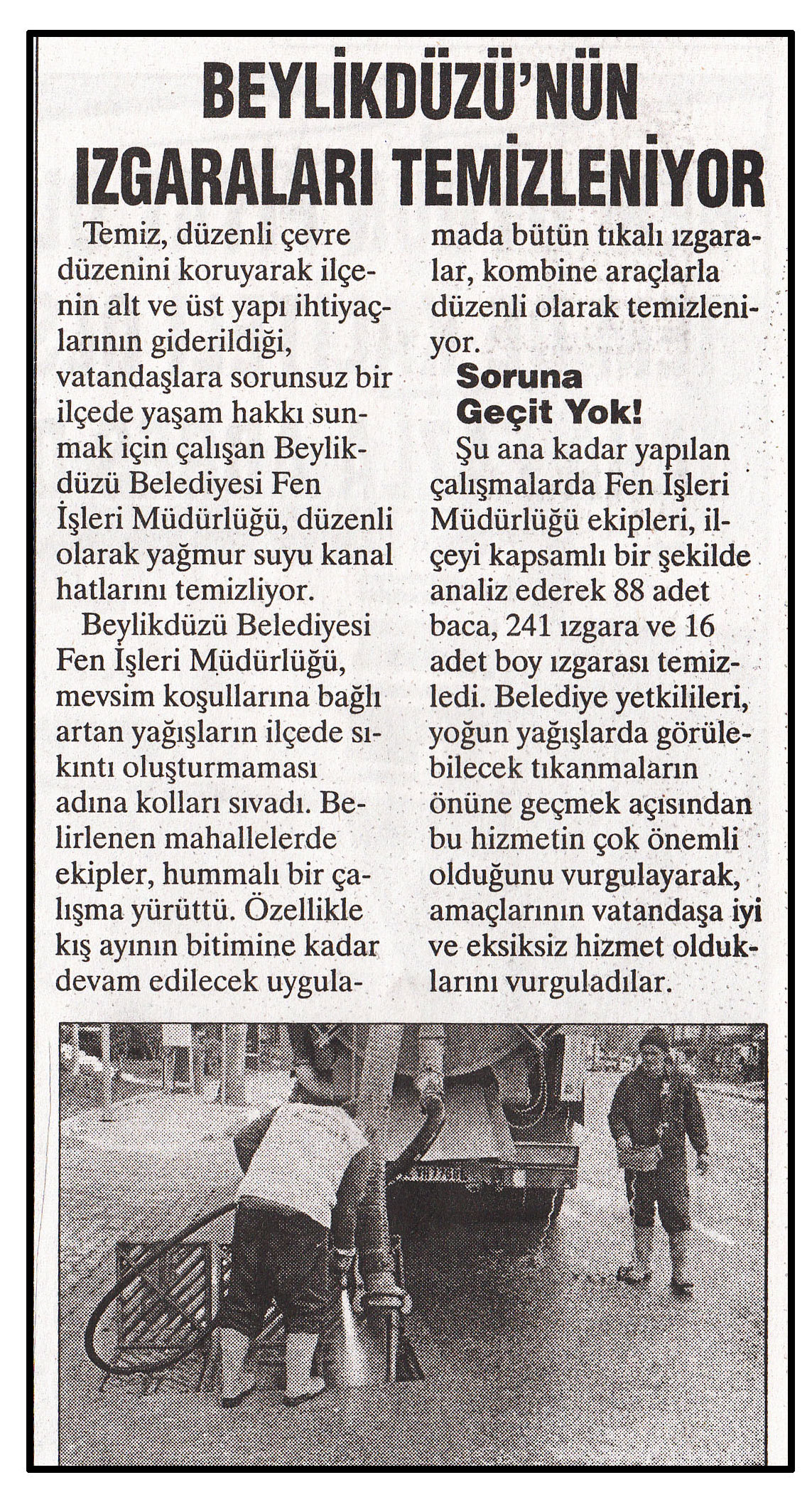 15 Ocak 2015 tarihli ''BÜYÜKÇEKMECE'' gazetesi. Temiz, düzenli çevre düzenini koruyarak ilçenin alt ve üst yapı ihtiyaçlarının giderildiği,vatandaşlara sorunsuz bir ilçede yaşam hakkı sunmak için çalışan Beylikdüzü Belediyesi Fen İşleri Müdürlüğü, düzenli olarak yağmur suyu kanal hatlarını temizliyor.