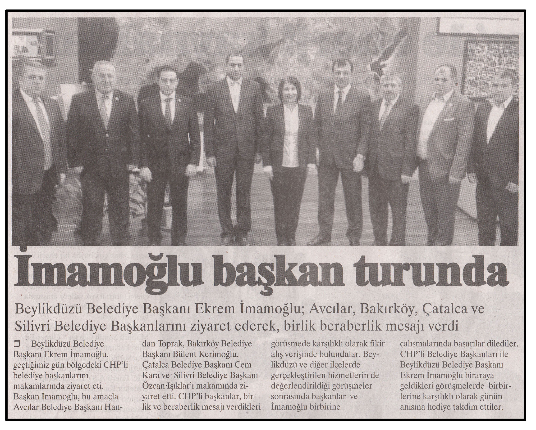 15 Ocak 2015 tarihli ''FARK GAZETESİ'' gazetesi. Beylikdüzü Belediye Başkanı Ekrem İmamoğlu; Avcılar, Bakırköy,Çatalca ve Silivri Belediye Başkanlarını ziyaret ederek,birlik beraberlik mesajı verdi.