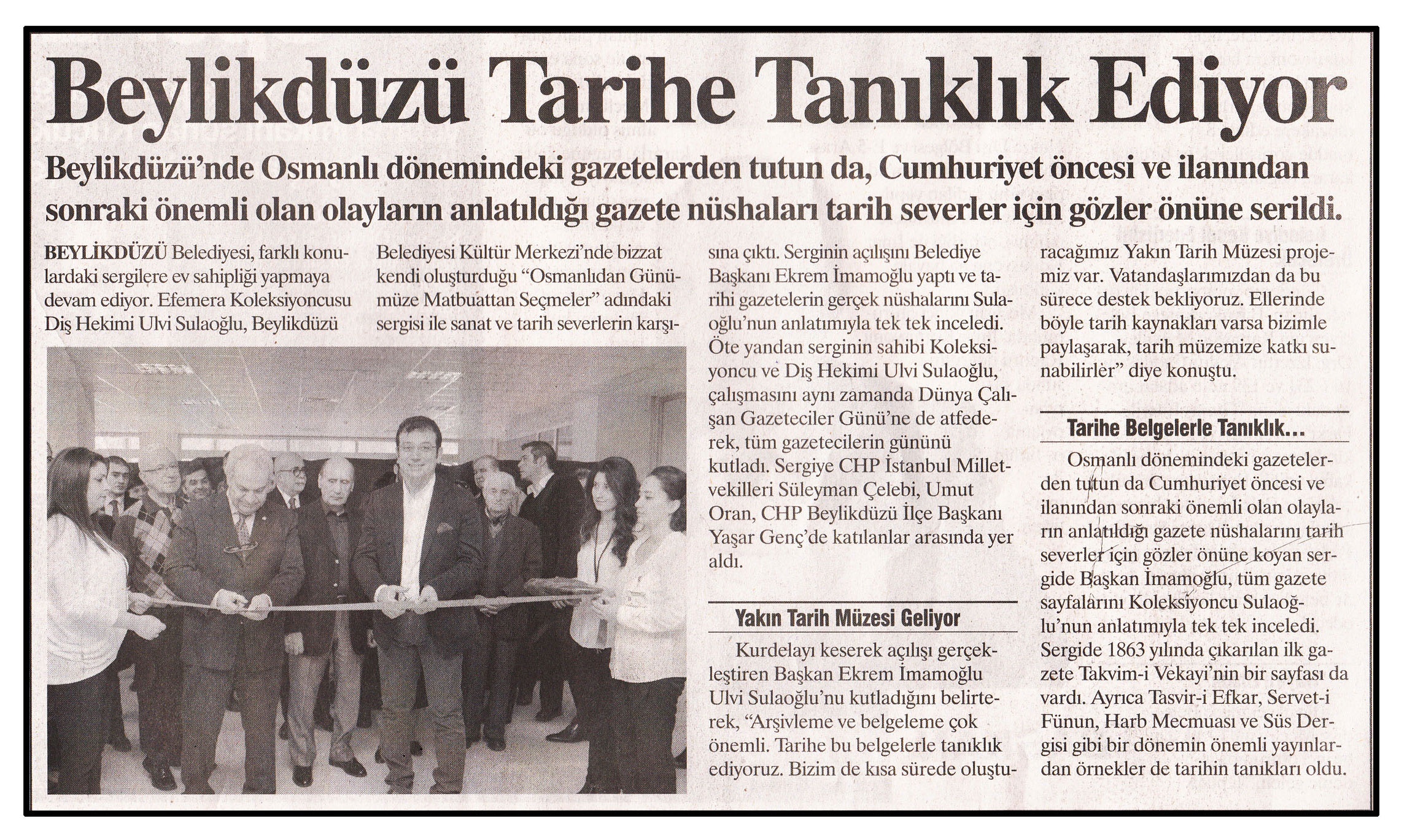 15 Ocak 2015 tarihli ''KENT GÜNDEM'' gazetesi. Beylikdüzü'nde Osmanlı dönemindeki gazetelerden tutunda, Cumhuriyet öncesi ve ilianından sonraki önemli olan olayların anlatıldığı gazete nüshaları tarih severler için gözler önüne serildi.