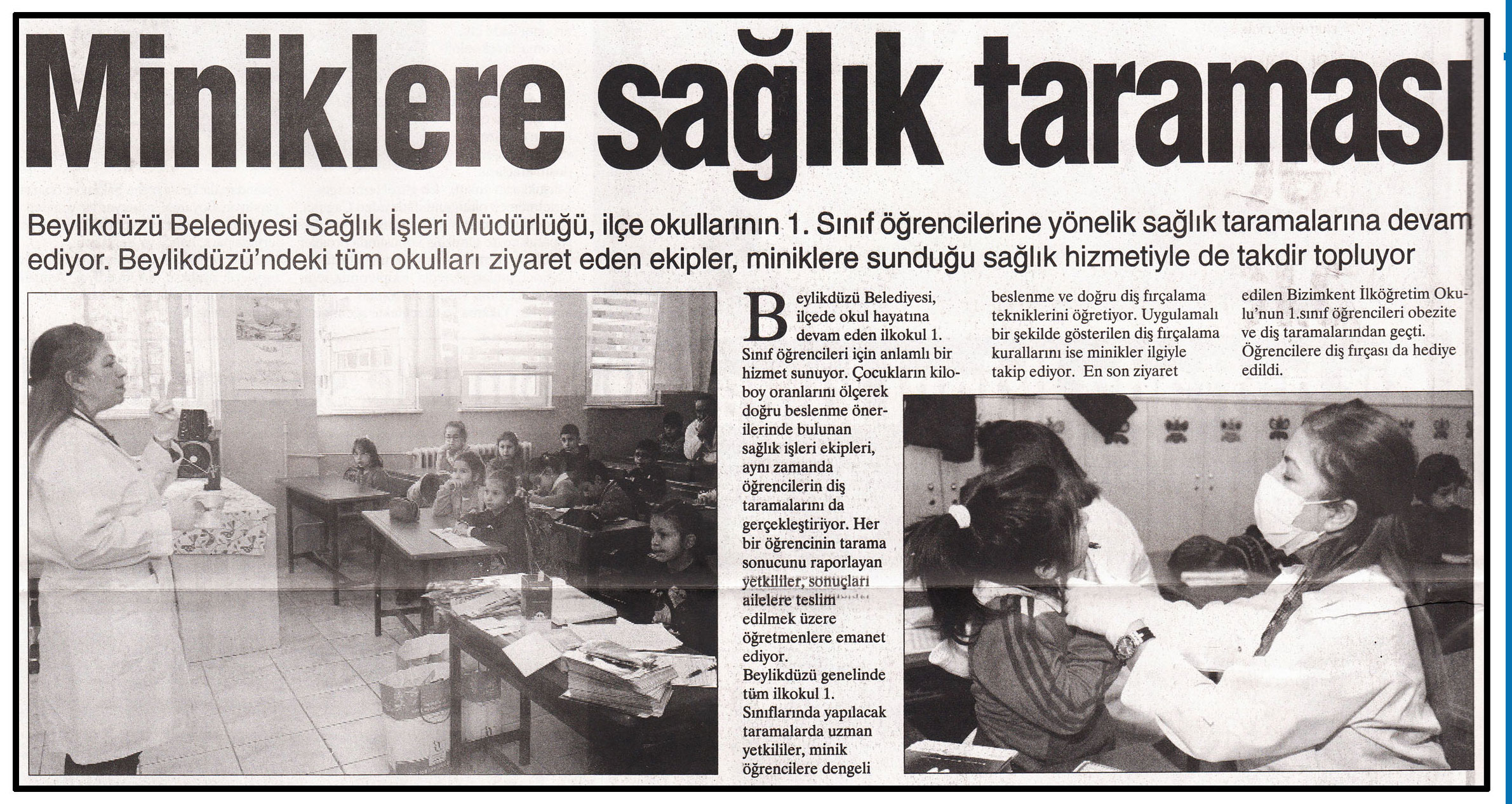 16 Ocak 2015 tarihli ''MANŞET'' gazetesi. Beylikdüzü Belediyesi Sağlık İşleri Müdürlüğü,ilçe okullarının 1. Sınıf öğrencilerine yönelik sağlık taramalarına devam ediyor.Beylikdüzü'ndeki tüm okulları ziyaret eden ekipler,miniklere sunduğu sağlık hizmetiyle de takdir topluyor.