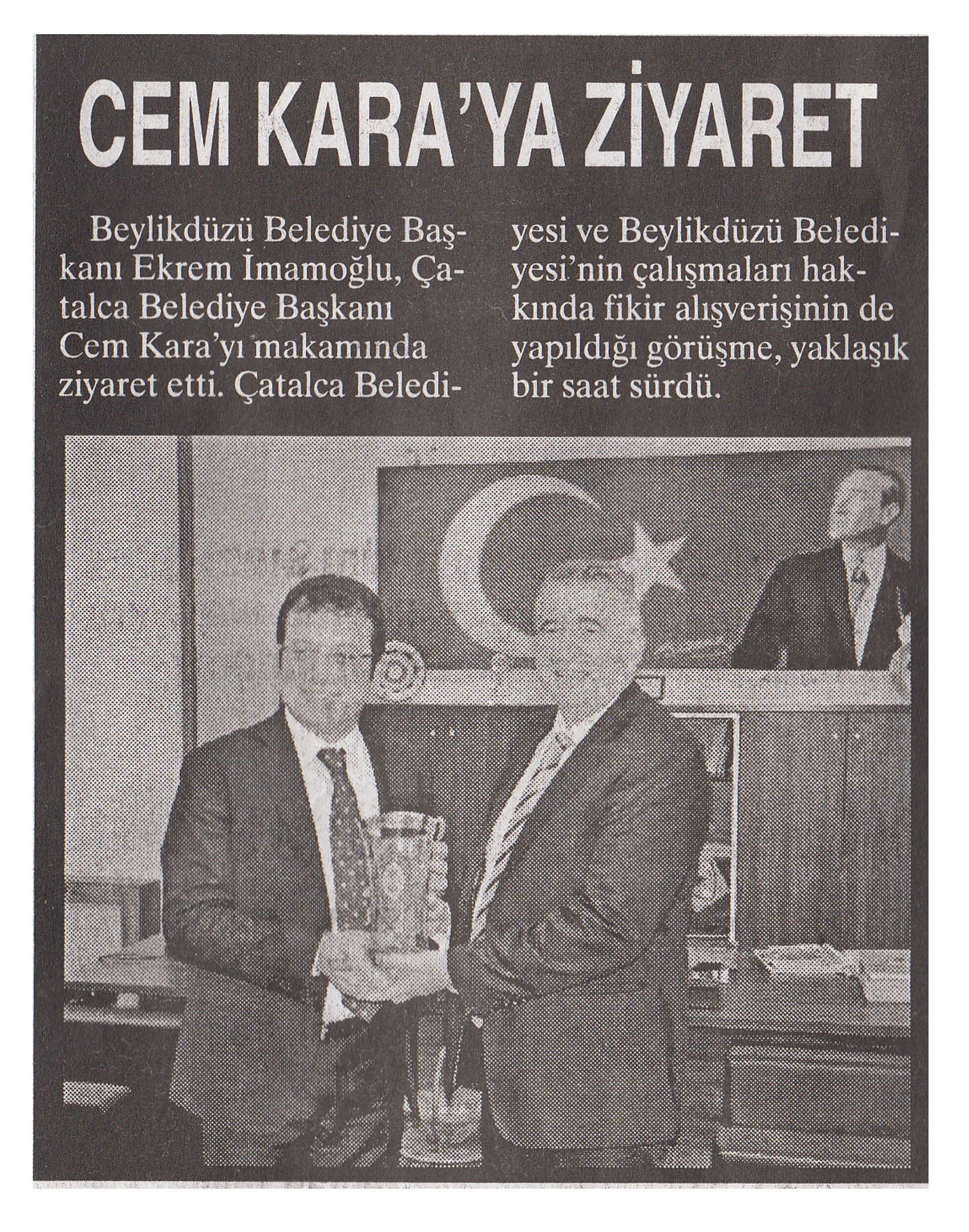 19 Ocak 2015 tarihli ''YURT HABER'' gazetesi. Beylikdüzü Belediye Başkanı Ekrem İmamoğlu,Çatalca Belediye Başkanı Cem Kara'yı makamında ziyaret etti.