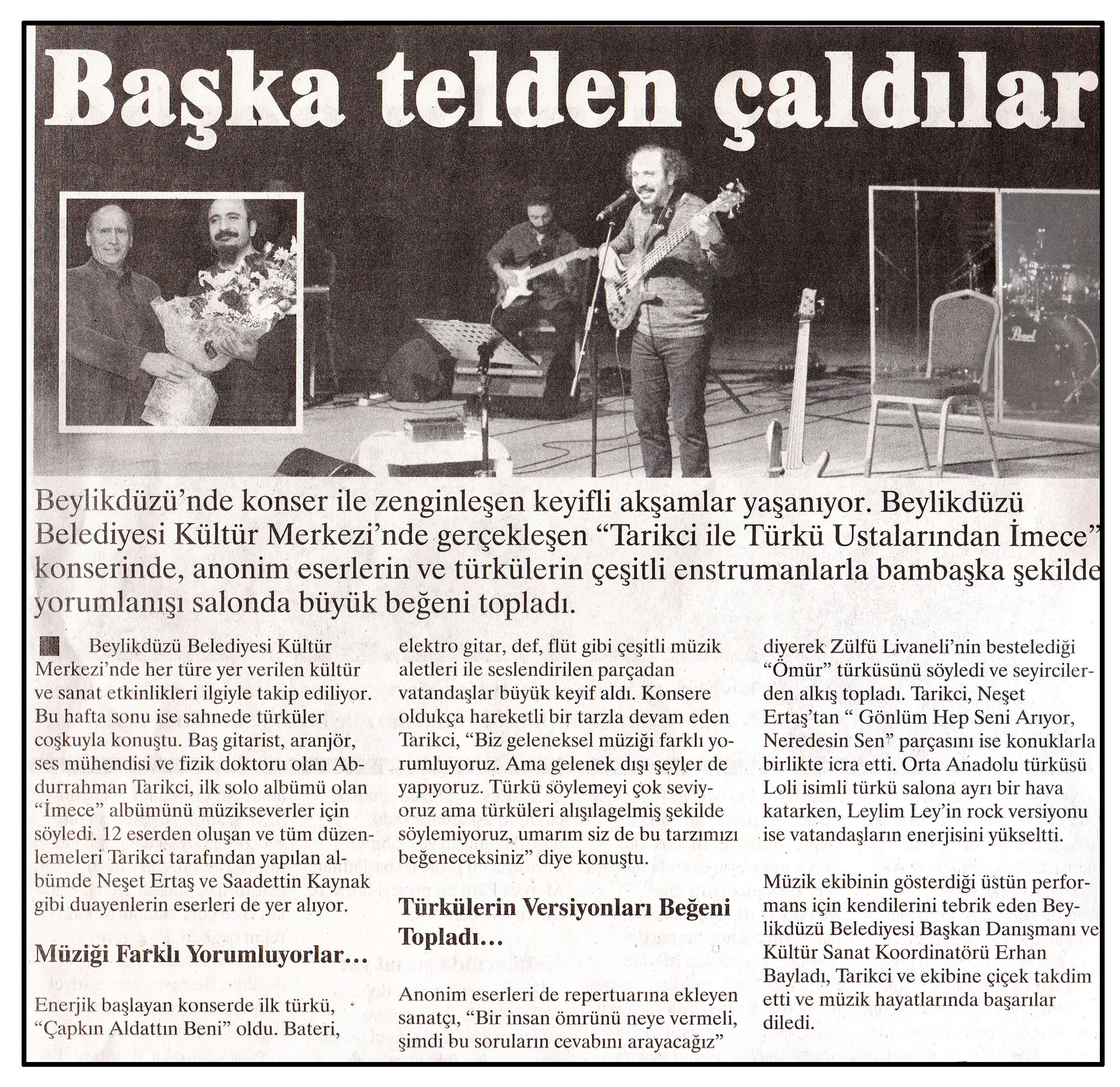 20 Ocak 2015 tarihli ''FARK GAZETESİ'' gazetesi. Beylikdüzü'nde konser ile zenginleşen keyifli akşamlar yaşanıyor.Beylikdüzü Belediyesi Kültür Merkezi'nde gerçekleşen ''Tarikci ve Türkü Ustalarından İmece'' konserinde, anonim eserlerin ve türkülerin çeşitli enstrumanlarla bambaşka şekilde yorumlanışı salonda büyük beğeni topladı.