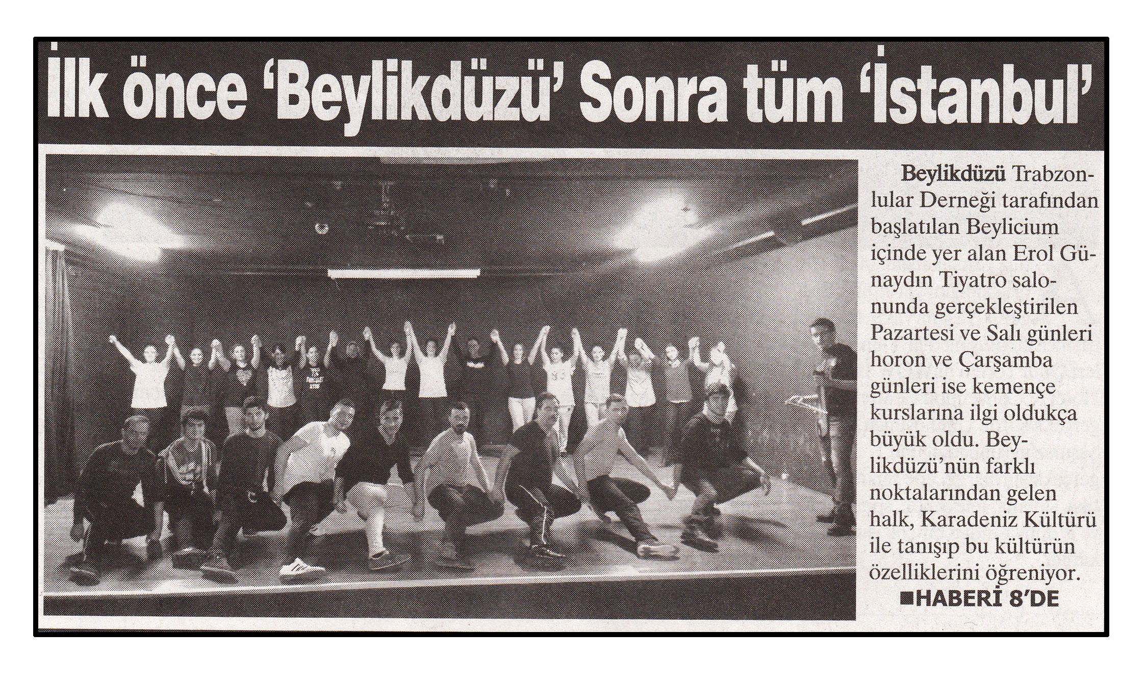 20 Ocak 2015 tarihli ''HABER EKSPRESS'' gazetesi. Beylikdüzü Trabzonlular Derneği tarafından başlatılan Beylicium içinde yer alan Erol Günaydın Tiyatro Salonunda gerçekleştirilen Pazartesi ve Salı günleri horon ve Çarşamba Günleri ise kemençe kurslarına ilgi oldukça büyük oldu.