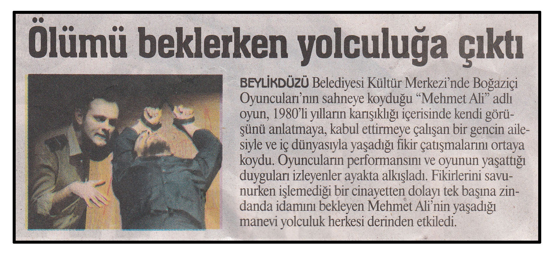 21 Ocak 2015 tarihli ''GAZETE İSTANBUL'' gazetesi. Beylikdüzü Belediyesi Kültür Merkezi'nde Boğaziçi Oyuncular'nın sahneye koyduğu ''Mehmet Ali'' adlı oyun,1980'li yılların karışıklığı içerisinde kendi görüşünü anlatmaya,kabul ettirmeye çalışan bir gencin ailesiyle ve iç dünyasıyla yaşadığı fikir çatışmalarını ortaya koydu.