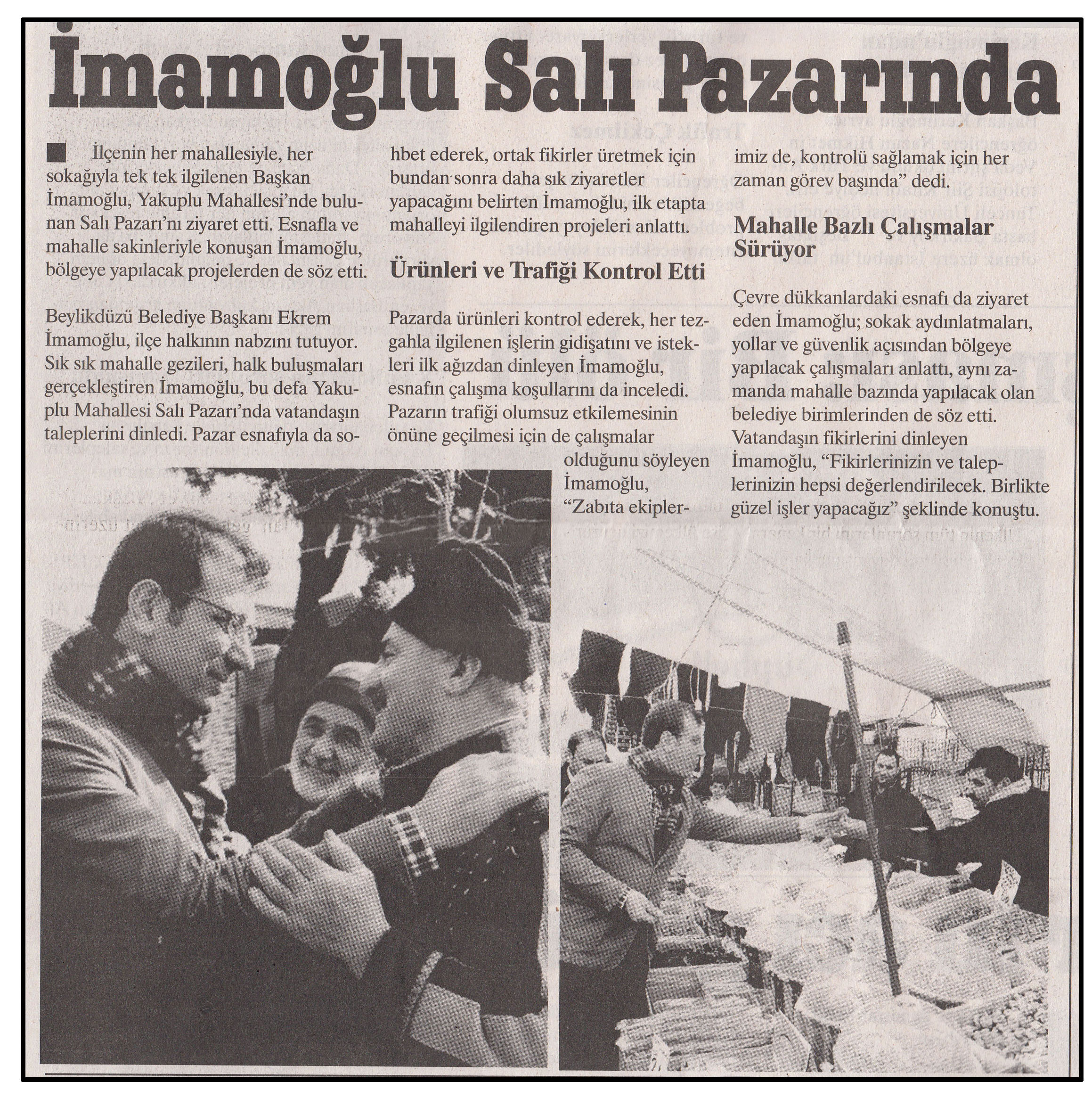 22 Ocak 2015 tarihli ''FARK GAZETESİ'' gazetesi. İlçenin her mahallesiyle,her sokağıyla tek tek ilgilenen Başkan İmamoğlu,Yakuplu Mahallesi'nde bulunan Salı Pazarı'nı ziyaret etti.Esnafla ve mahalle sakinleriyle konuşan İmamoğlu,bölgeye yapılacak projelerden de söz etti.