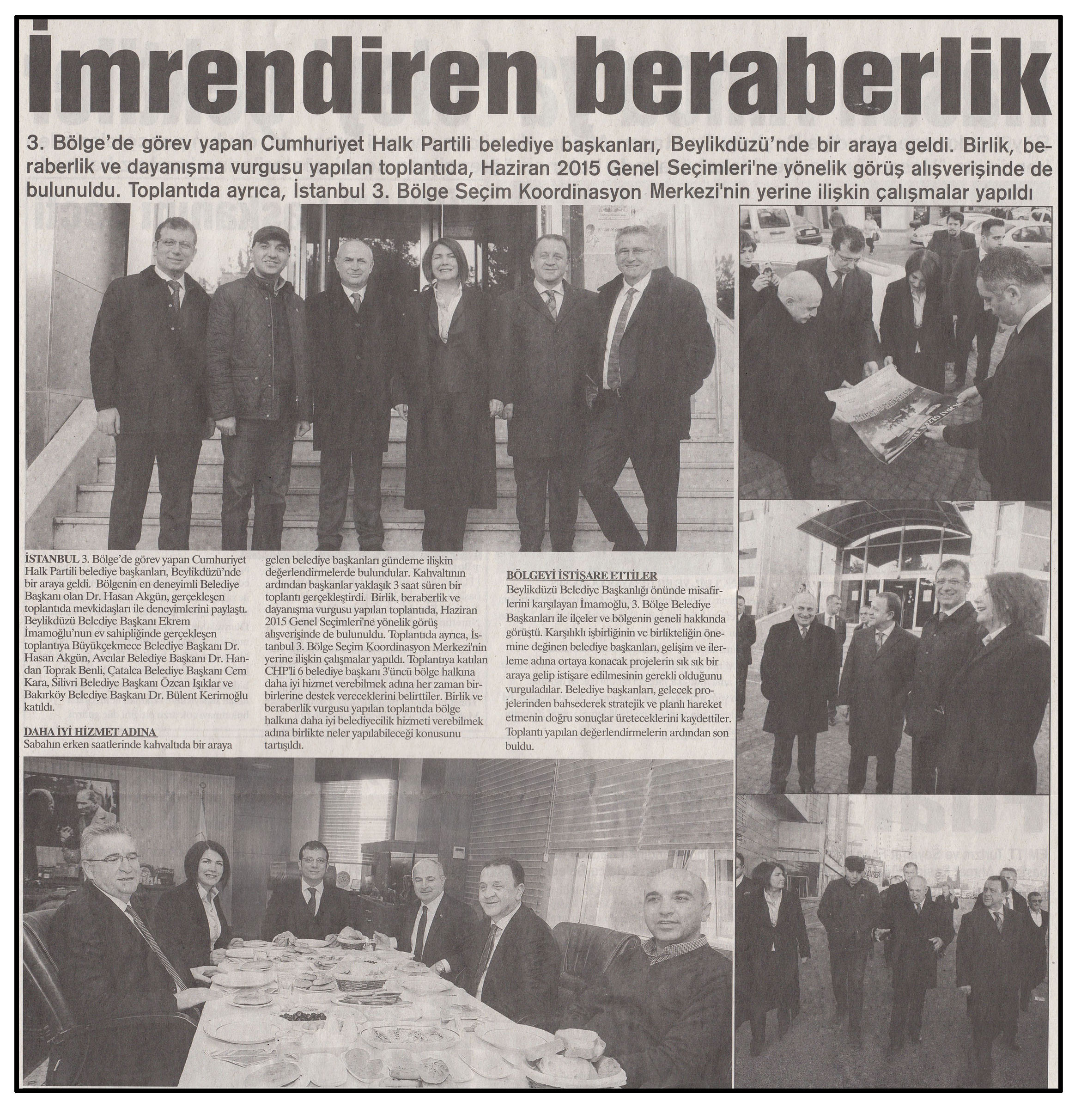 23 Ocak 2015 tarihli ''YENİ GÜN'' gazetesi. 3. Bölge'de görev yapan Cumhuriyet Halk Partili belediye başkanları,Beylikdüzü'nde bir araya geldi.Birlik,beraberlik ve dayanışma vurgusu yapılan toplantıda,Haziran 2015 Genel Seçimleri'ne yönelik görüş alışverişinde de bulunuldu.Toplantıda ayrıca,İstanbul 3.Bölge Seçim Koordinasyon Merkezi'nin yerine ilişkin çalışmalar yapıldı.