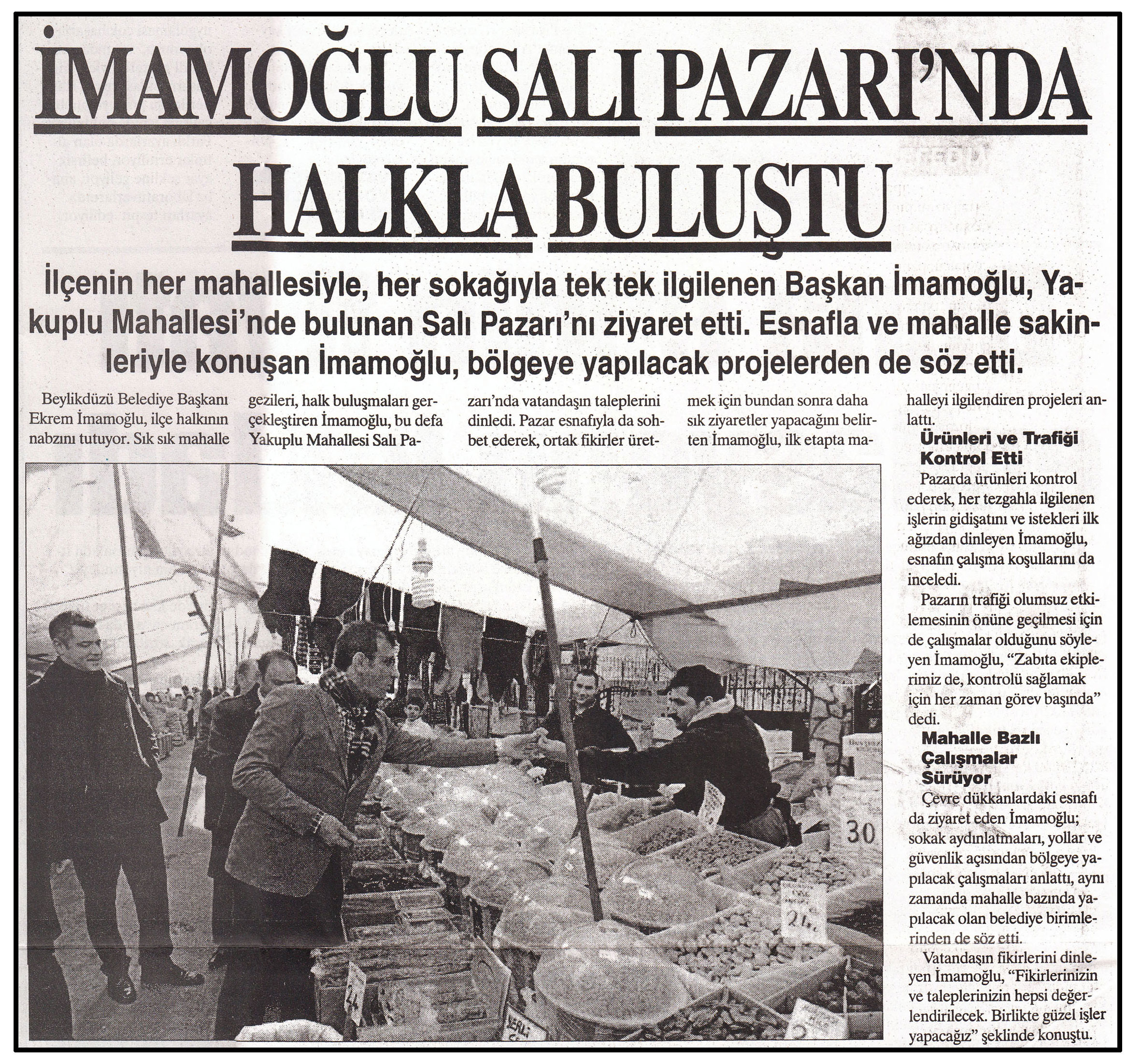 26 Ocak 2015 tarihli ''BÜYÜKÇEKMECE'' gazetesi. İlçenin her mahallesiyle,her sokağıyla tek tek ilgilenen Başkan İmamoğlu,Yakuplu Mahallesi'nde bulunan Salı Pazarı'nı ziyaret etti.Esnafla ve mahalle sakinleriyle konuşan İmamoğlu,bölgeye yapılacak projelerden de söz etti.