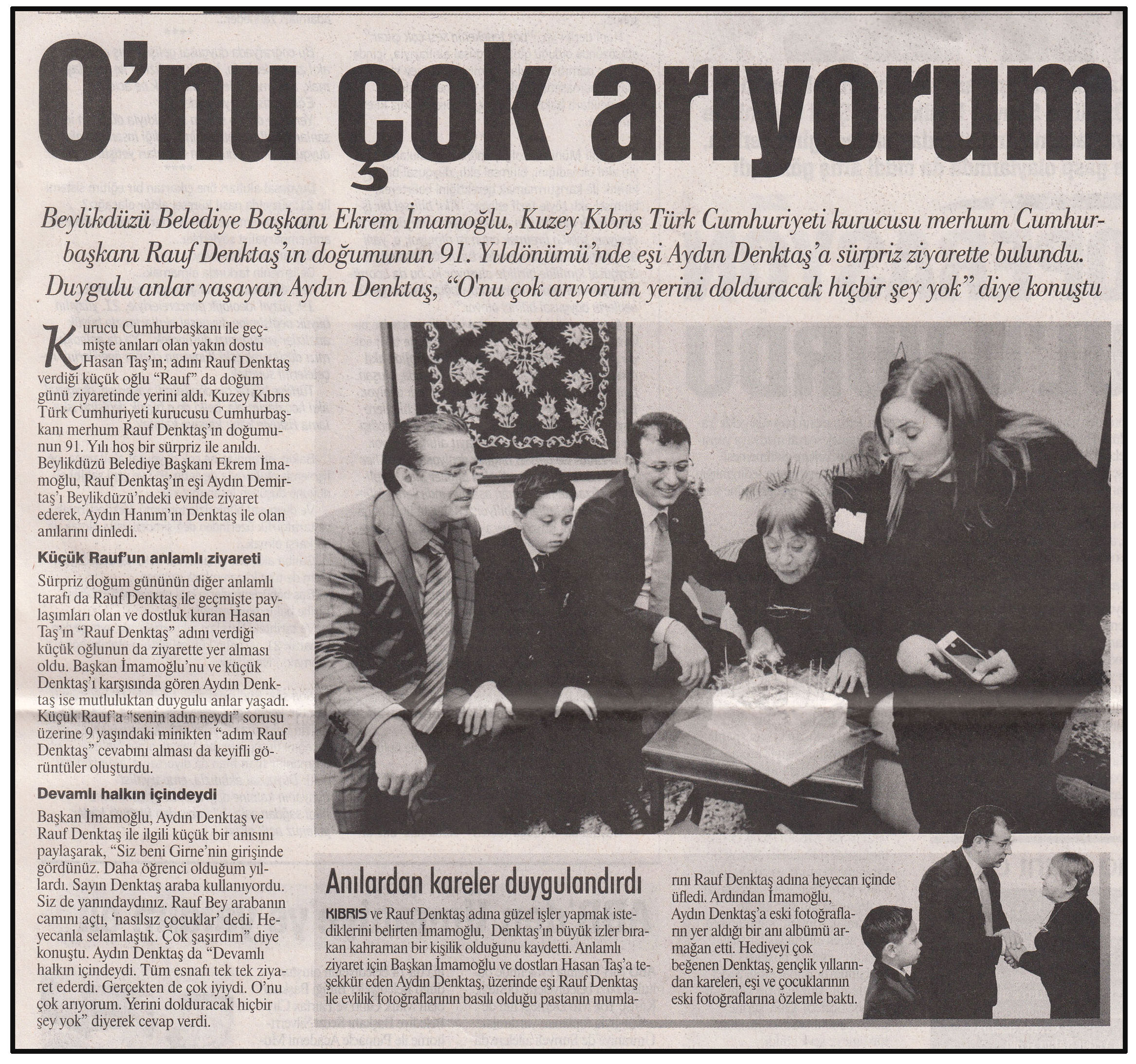 27 Ocak 2015 tarihli ''GAZETE İSTANBUL'' gazetesi. Beylikdüzü Belediye Başkanı Ekrem İmamoğlu,Kuzey Kıbrıs Türk Cumhuriyeti kurucusu merhum Cumhurbaşkanı Rauf Denktaş'ın doğumunun 91. Yıldönümü'nde eşi Aydın Denktaş'a süpriz ziyarette bulundu.
