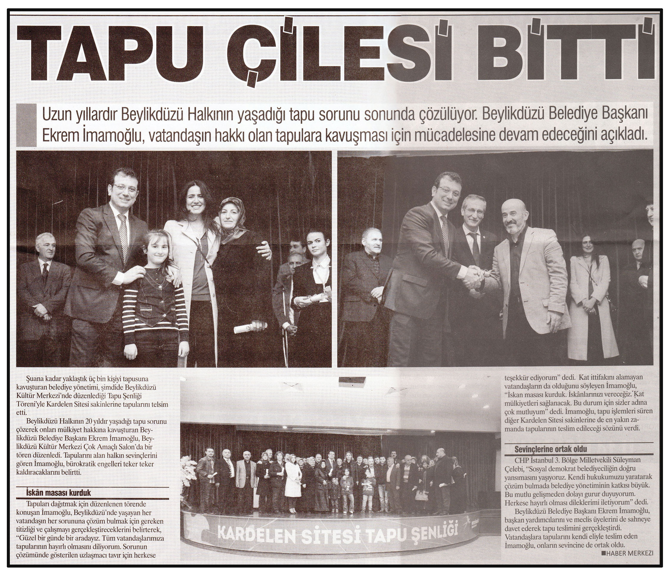 27 Ocak 2015 tarihli ''HABER EKSPRESS'' gazetesi. Uzun yıllardır Beylikdüzü Halkının yaşadığı tapu sorunu sonunda çözülüyor.Beylikdüzü Belediye Başkanı Ekrem İmamoğlu,vatandaşın hakkı olan tapulara kavuşması için mücadelesine devam edeceğini açıkladı.