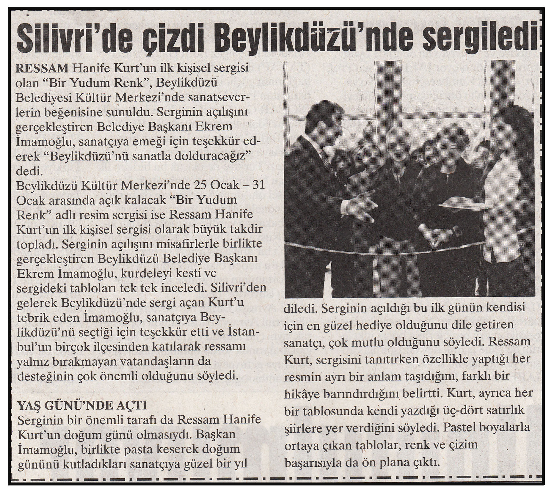 27 Ocak 2015 tarihli ''YENİ GÜN'' gazetesi. Ressam Hanife Kurt'un ilk kişisel sergisi olan ''Bir Yudum Renk'', Beylikdüzü Belediyesi Kültür Merkezi'nde sanatseverlerin beğenisine sunuldu.Serginin açılışını gerçekleştiren Belediye Başkanı Ekrem İmamoğlu,sanatçıya emeği için teşekkür ederek ''Beylikdüzü'nü sanatla dolduracağız'' dedi.