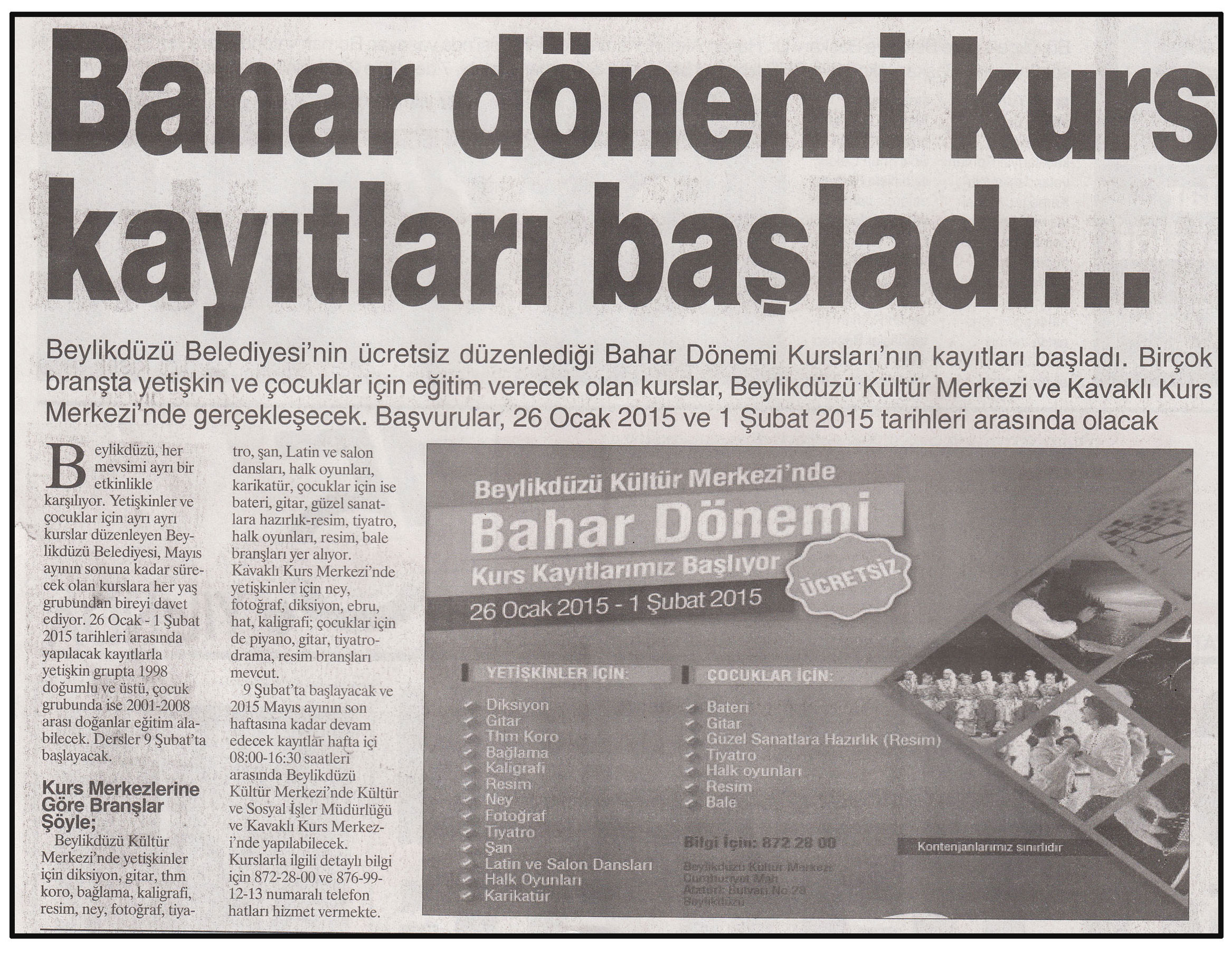 28 Ocak 2015 tarihli ''MANŞET'' gazetesi. Beylikdüzü Belediyesi'nin ücretsiz düzenlediği Bahar Dönemi Kursları'nın kayıtları başladı.Birçok branşta yetişkin ve çocuklar için eğitim verecek olan kurslar,Beylikdüzü Kültür Merkezi ve Kavaklı Kurs Merkezi'nde gerçekleşecek.Başvurular,26 Ocak 2015 ve 1 Şubat 2015 tarihleri arasında olacak.