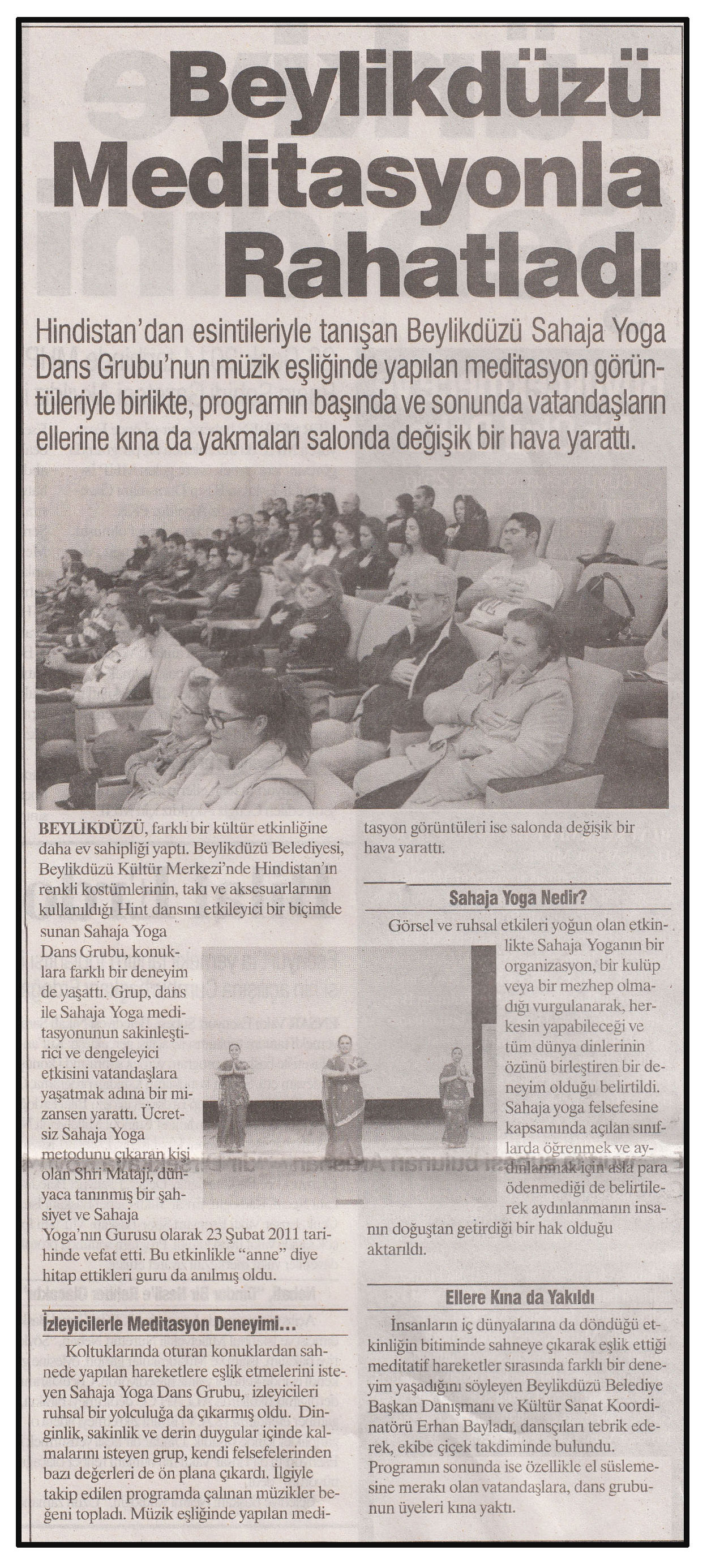 29 Ocak 2015 tarihli ''KENT GÜNDEM'' gazetesi. Hindistan'dan esintileriyle tanışan Beylikdüzü Sahaja Yoga Dans Grubu'nun müzik eşliğinde yapılan meditasyon görüntüleriyle birlikte,programın başında ve sonunda vatandaşların ellerine kına da yakmaları salonda değişik bir hava yarattı.