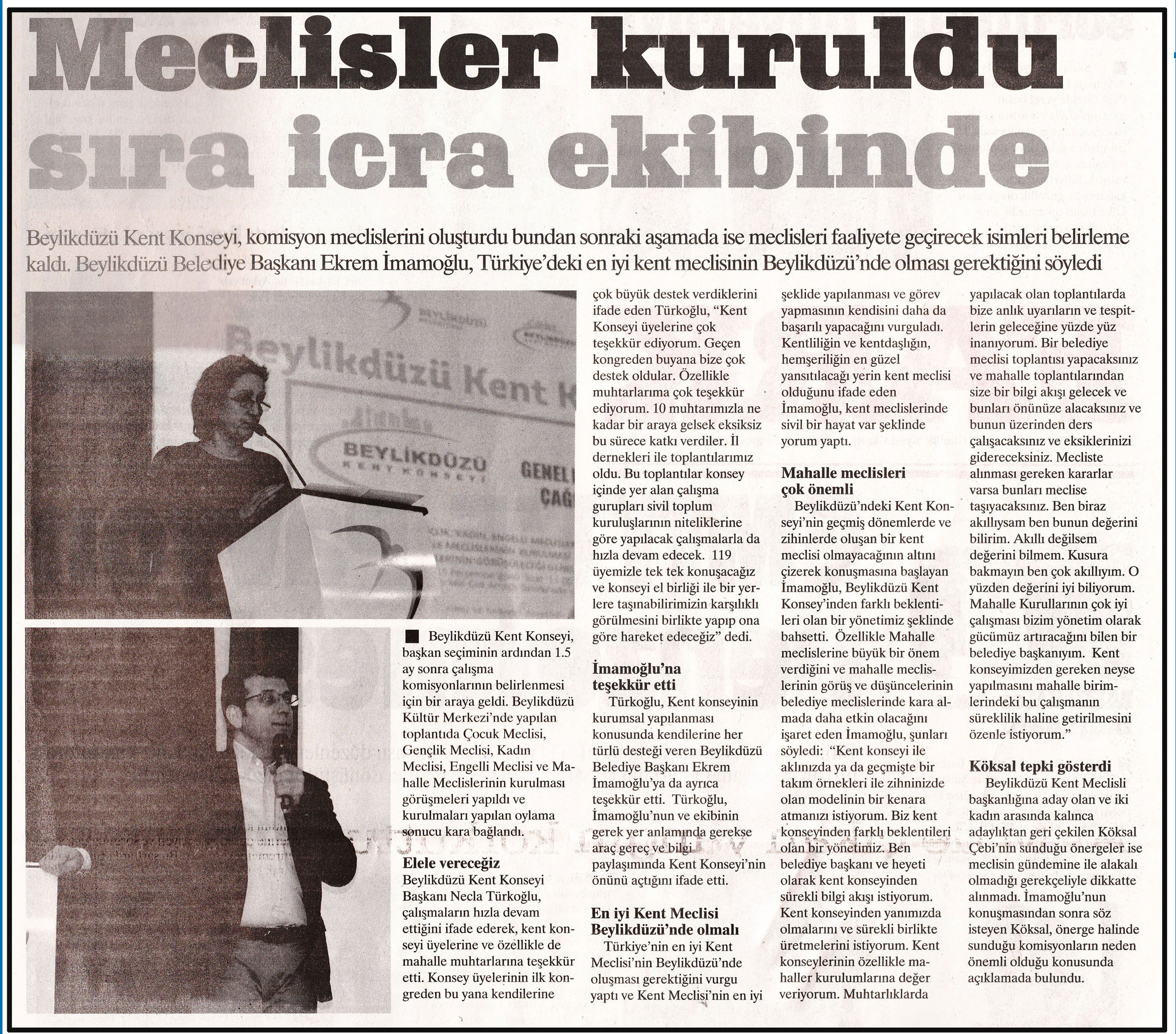 30 Ocak 2015 tarihli ''FARK GAZETESİ'' gazetesi. Beylikdüzü Kent Konseyi,komisyon meclislerini oluşturdu,bundan sonraki aşamada ise meclisleri faaliyete geçirecek isimleri belirmek kaldı.Beylikdüzü Belediye Başkanı Ekrem İmamoğlu,Türkiye'deki en iyi kent meclisinin Beylikdüzü'nde olması gerektiğini söyledi.