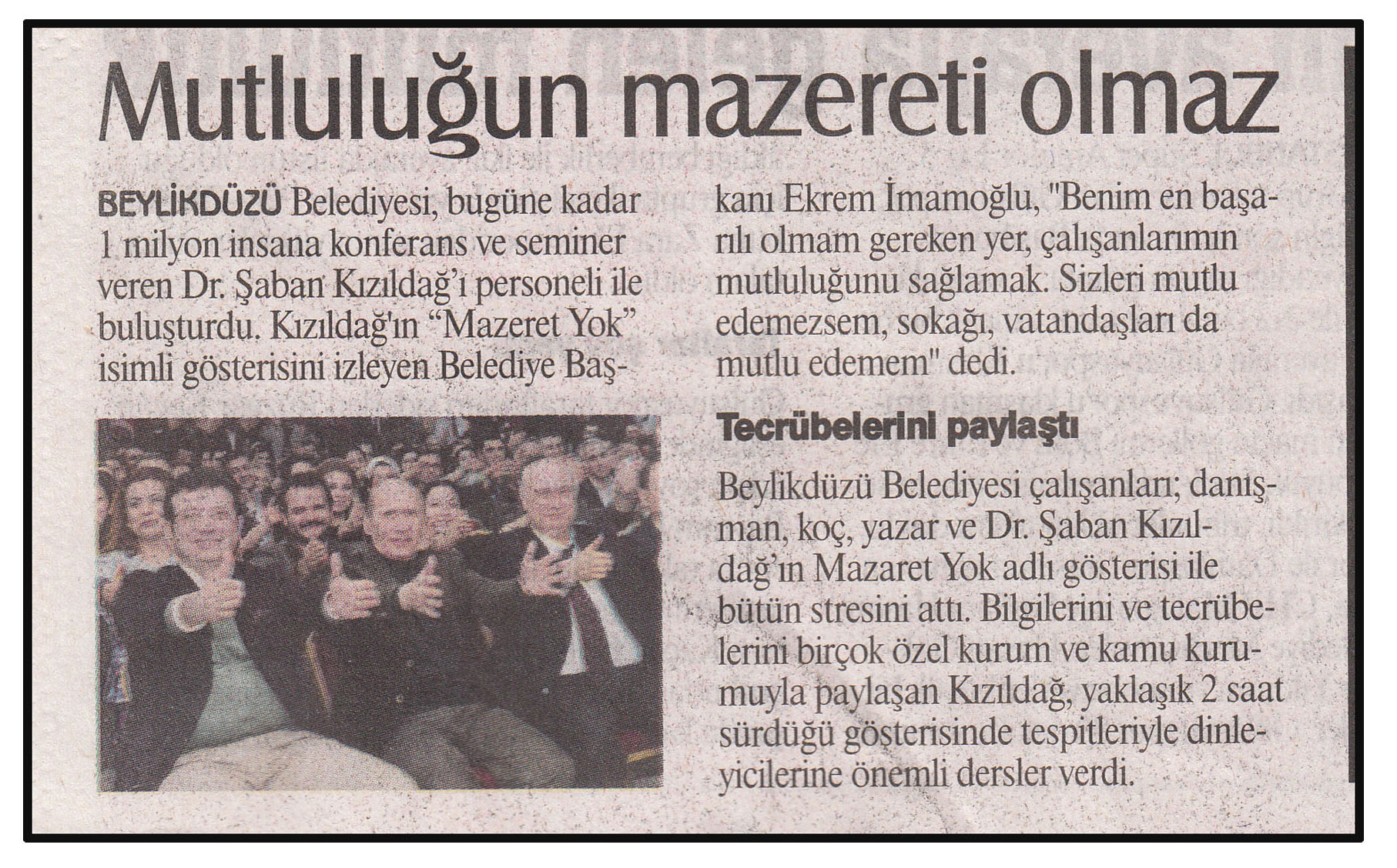 3 Şubat 2015 tarihli ''GAZETE İSTANBUL'' gazetesi. Beylikdüzü Belediyesi,bugüne kadar 1 milyon insana konferans ve seminer veren Dr. Şaban Kızıldağ'ı personeli ile buluşturdu.