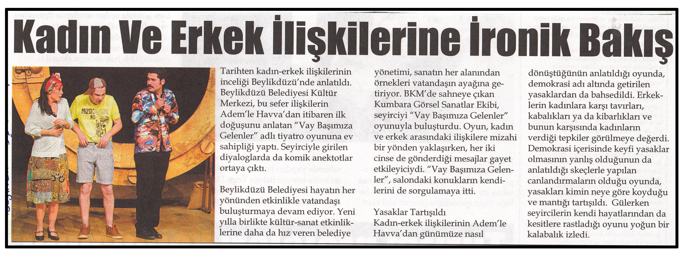 5 Şubat 2015 tarihli ''BEYLİKDÜZÜ'' gazetesi. Tarihten kadın-erkek ilişkilerinin inceliği Beylikdüzü'nde anlatıldı.Beylikdüzü Belediyesi Kültür Merkezi,bu sefer ilişkilerin Adem'le Havva'dan itibaren ilk doğuşunu anlatan ''Vay Başımıza Gelenler'' adlı tiyatro oyununa ev sahipliği yaptı.Seyirciyle girilen diyaloglarda da komik anektotlar ortaya çıktı.