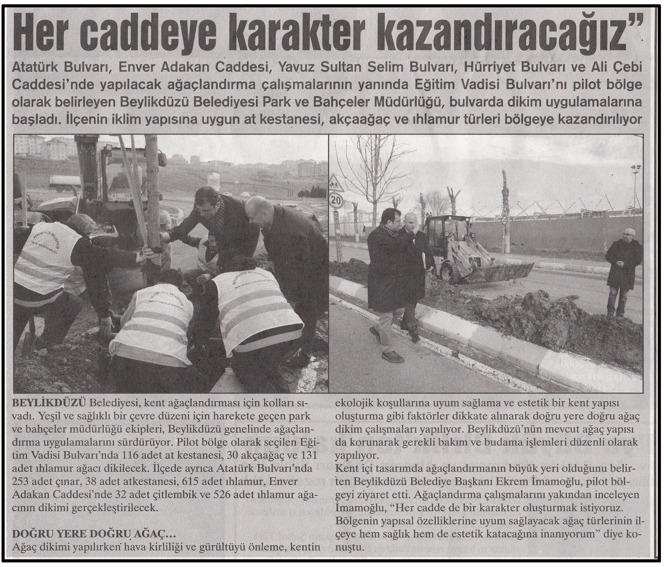 5 Şubat 2015 tarihli ''YENİ GÜN'' gazetesi. Atatürk Bulvarı,Enver Adakan Caddesi,Yavuz Sultan Selim Bulvarı,Hürriyet Bulvarı ve Ali Çebi Caddesi'nde yapılacak ağaçlandırma çalışmalarının yanında Eğitim Vadisi Bulvarı'nı pilot bölge olarak belirleyen Beylikdüzü Belediyesi Park ve Bahçeler Müdürlüğü,bulvarda dikim uygulamalarına başladı.