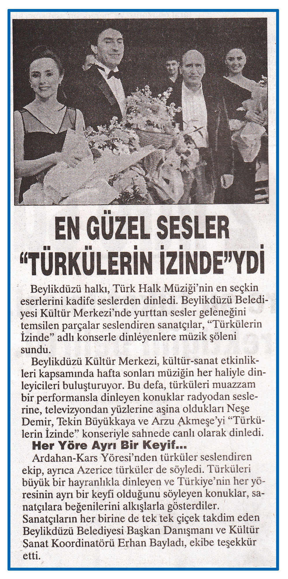 9 Şubat 2015 tarihli ''BÜYÜKÇEKMECE'' gazetesi. Beylikdüzü halkı,Türk Halk Müziği'nin en seçkin eserlerini kadife seslerden dinledi.Beylikdüzü Belediyesi Kültür Merkezi'nde yurttan sesler geleneğini temsilen parçalar seslendiren sanatçılar,''Türkülerin İzinde'' adlı konserle dinleyenlere müzik şöleni sundu.
