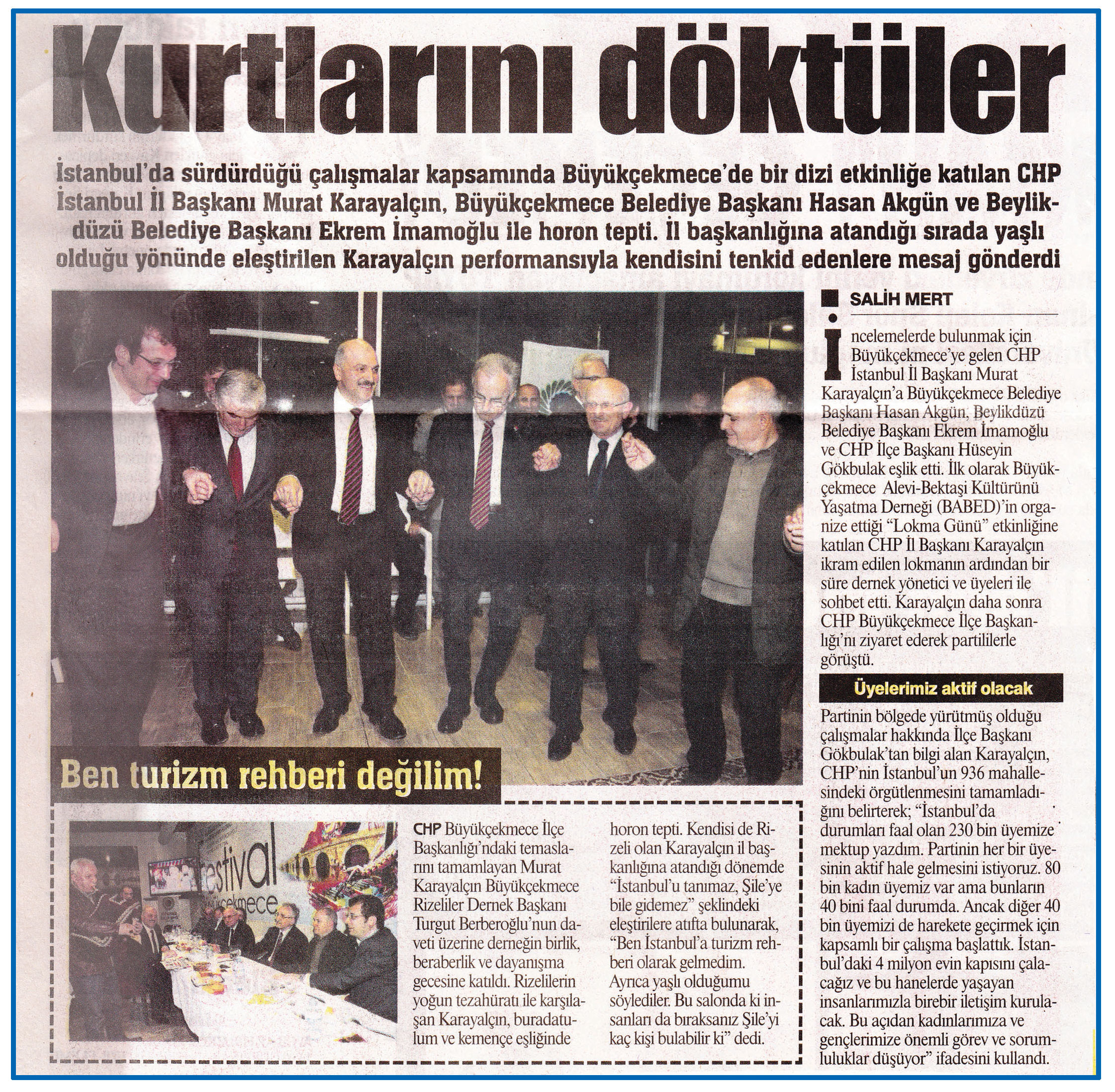 9 Şubat 2015 tarihli ''GAZETE İSTANBUL'' gazetesi. İstanbul'da sürdürdüğü çalışmalar kapsamında Büyükçekmece'de bir dizi etkinliğe katılan CHP İstanbul İl Başkanı Murat Karayalçın,Büyükçekmece Belediye Başkanı Hasan Akgün ve Beylikdüzü Belediye Başkanı Ekrem İmamoğlu ile horon tepti.İl başkanlığına atandığı sırada yaşlı olduğu yönünde eleştirilen Karayalçın performansıyla kendisini tenkid edenlere mesaj gönderdi.