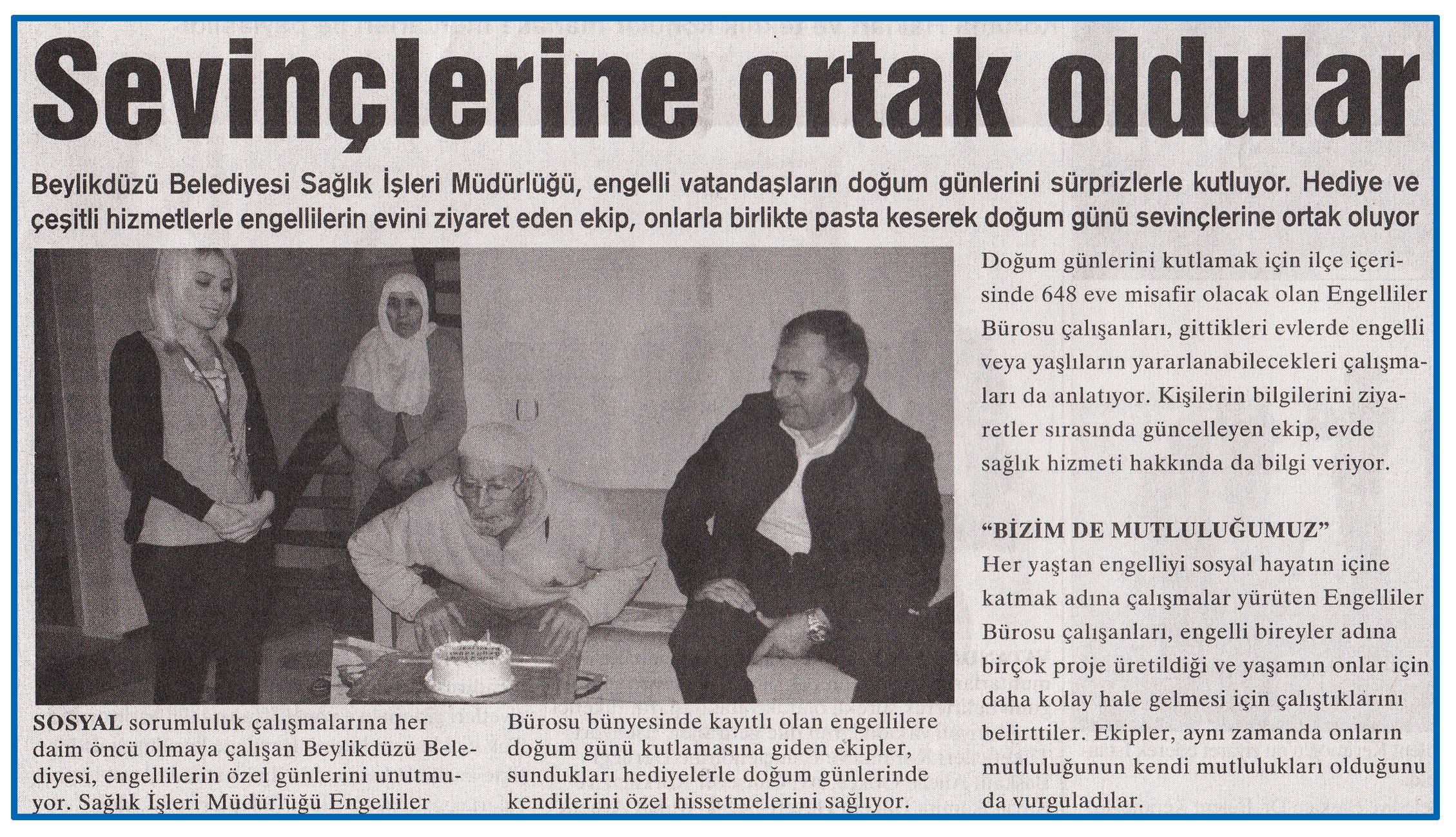 9 Şubat 2015 tarihli ''YENİ GÜN'' gazetesi. Beylikdüzü Belediyesi Sağlık İşleri Müdürlüğü,engelli vatandaşların doğum günlerini süprizlerle kutluyor.Hediye ve çeşitli hizmetlerle engellilerin evini ziyaret eden ekip,onlarla birlikte pasta keserek doğum günü sevinçlerine ortak oluyor.