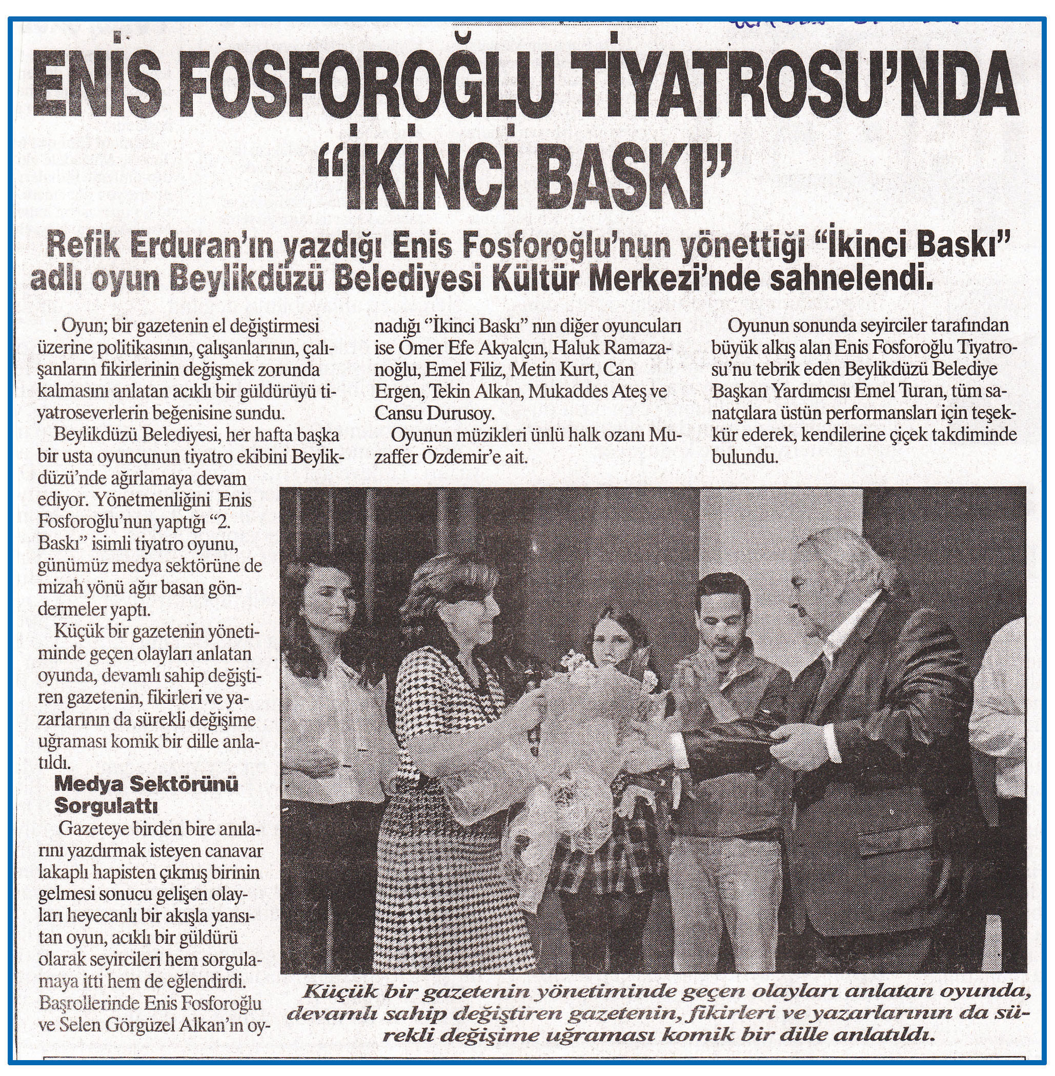 9 Şubat 2015 tarihli ''YURT HABER'' gazetesi. Refik Erduran'ın yazdığı Enis Fosforoğlu'nun yönettiği ''İkinci Baskı'' adlı oyun Beylikdüzü Belediyesi Kültür Merkezi'nde sahnelendi.