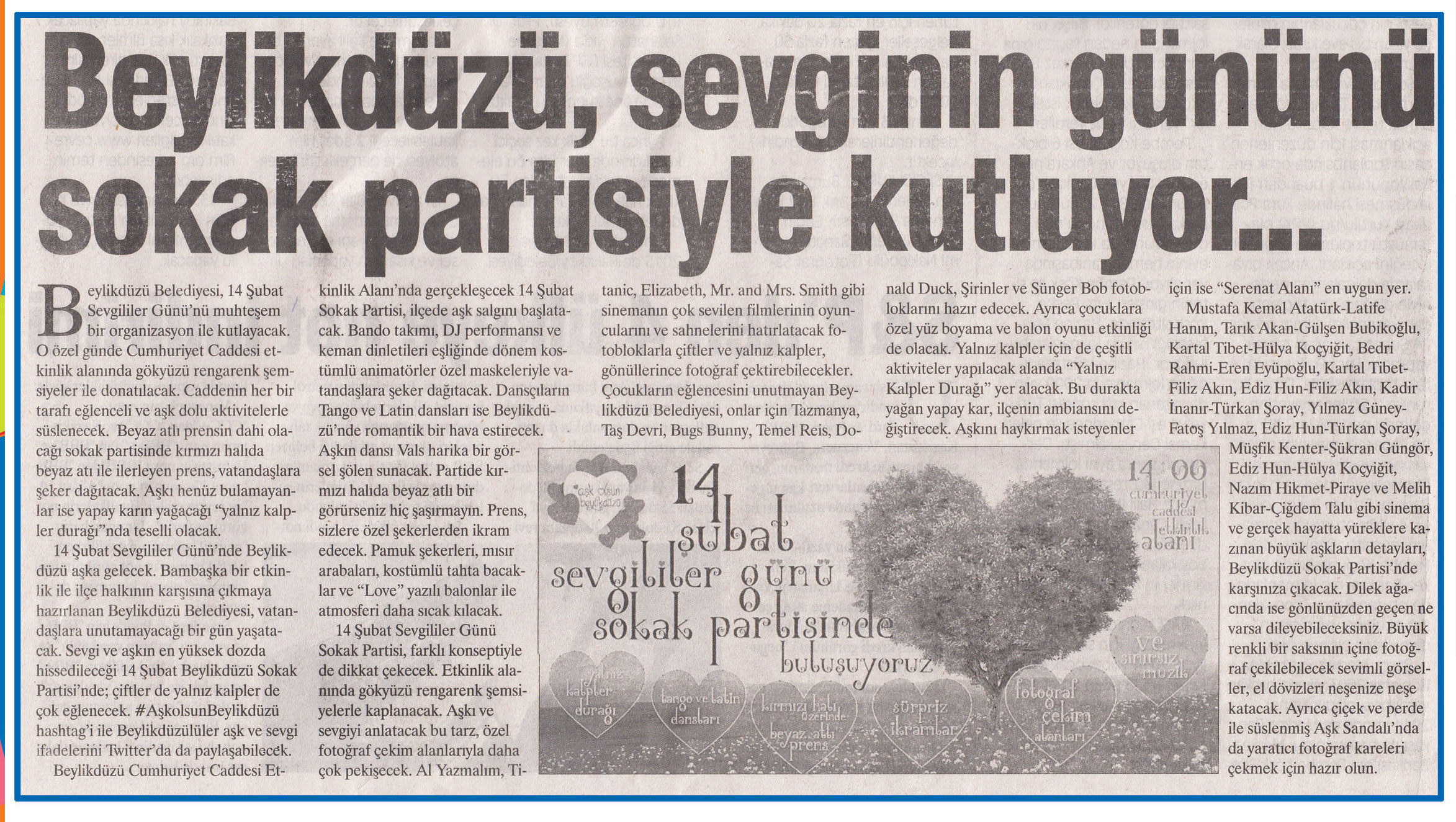 11 Şubat 2015 tarihli ''DEĞİŞİM'' gazetesi. Beylikdüzü Belediyesi, 14 Şubat Sevgililer Günü'nü muhteşem bir organizasyon ile kutlayacak, O özel günde Cumhuriyet Caddesi etkinlik alanında gökyüzü rengarenk şemsiyeler ile donatılacak.Caddenin her bir tarafı eğlenceli ve aşk dolu aktivitelerle süslenecek.