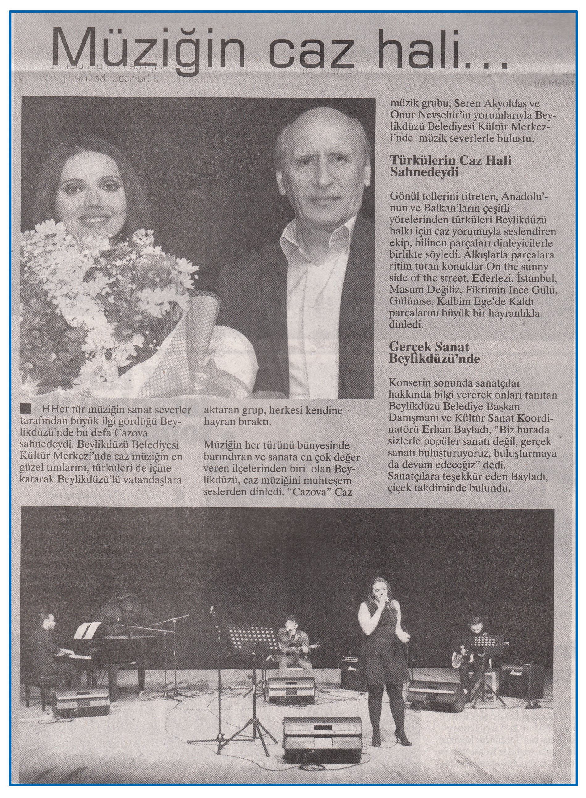 11 Şubat 2015 tarihli ''FARK GAZETESİ'' gazetesi. Her tür müziğin sanat severler tarafından büyük ilgi gördüğü Beylikdüzü'nde bu defa Cazova sahnedeydi.Beylikdüzü Belediyesi Kültür Merkezi'nde caz müziğin en güzel tınılarını,türküleri de içine katarak Beylikdüzü'lü vatandaşlara aktaran grup,herkesi kenine hayran bıraktı.
