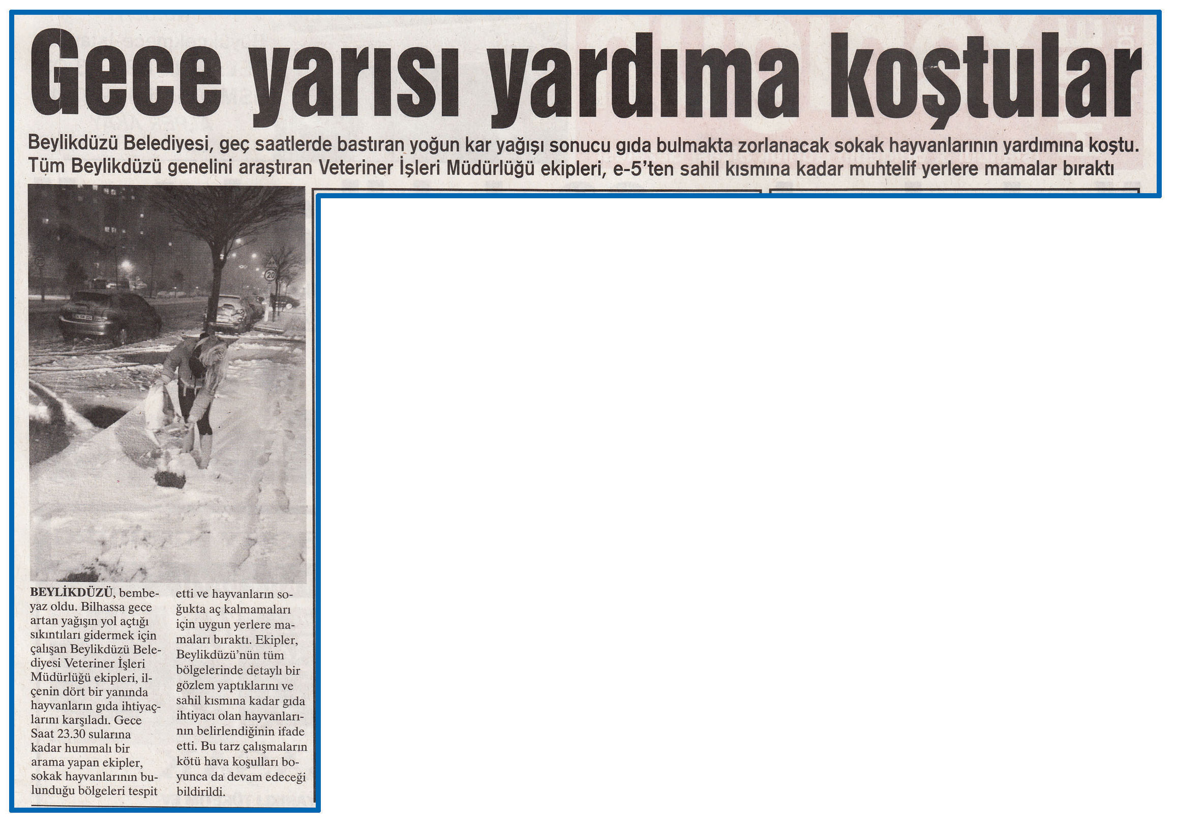 12 Şubat 2015 tarihli ''YENİ GÜN'' gazetesi. Beylikdüzü Belediyesi,geç saatlerde bastıran yoğun kar yağışı sonucu gıda bulmakta zorlanacak sokak hayvanlarının yardımına koştu.Tüm Beylikdüzü genelini araştıran Veteriner İşleri Müdürlüğü ekipleri, e-5'ten sahil kısmına kadar muhtelif yerlere mamalar bıraktı.