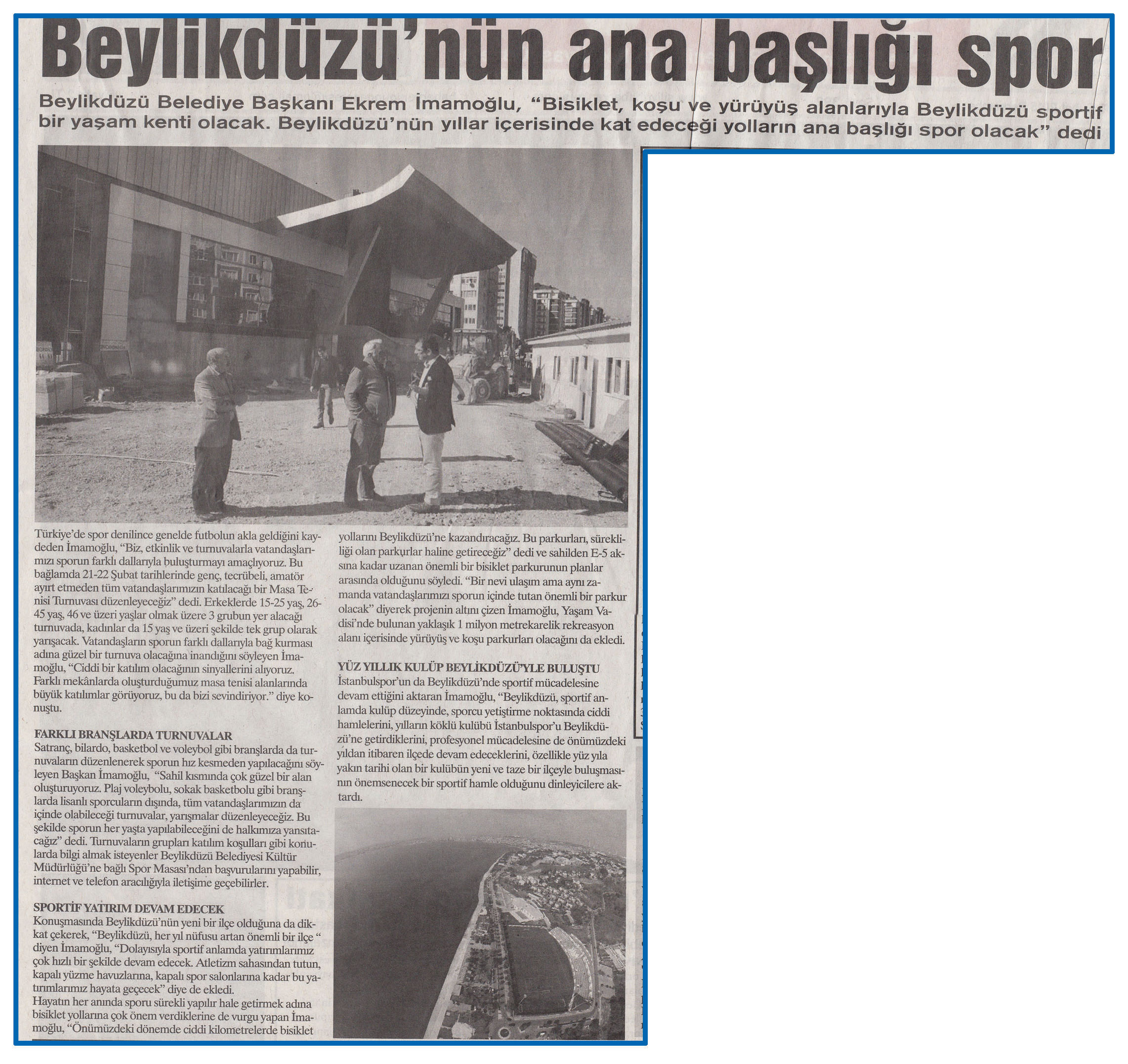 12 Şubat 2015 tarihli ''YENİ GÜN'' gazetesi. Beylikdüzü Belediye Başkanı Ekrem İmamoğlu, ''Bisiklet,koşu ve yürüyüş alanlarıyla Beylikdüzü sportif bir yaşam kenti olacak.Beylikdüzü'nün yıllar içerisinde kat edeceği yolların ana başlığı spor olacak'' dedi.
