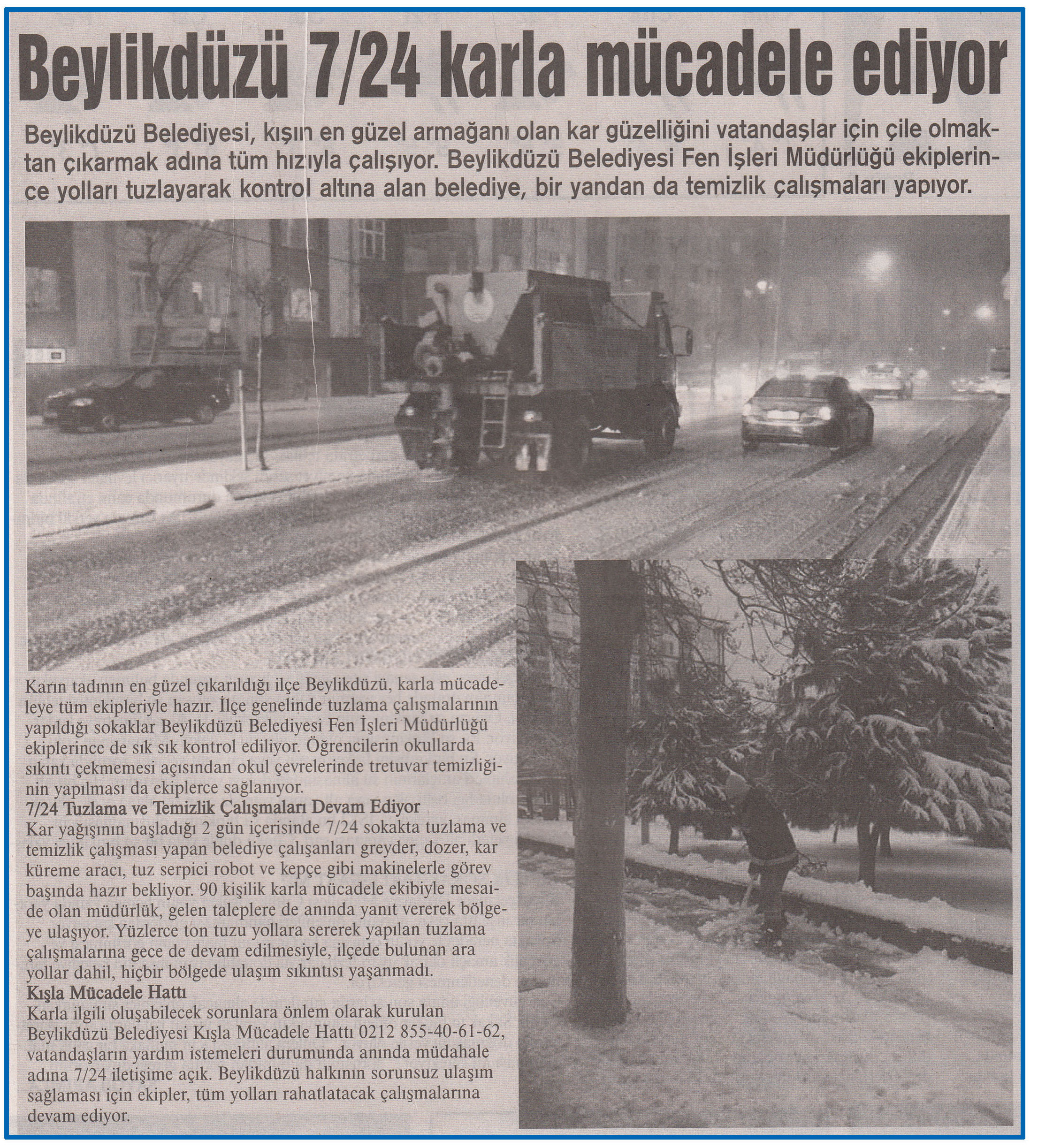 13 Şubat 2015 tarihli ''MARMARA'' gazetesi. Beylikdüzü Belediyesi,kışın en güzel armağanı olan kar güzelliğini vatandaşlar için çile olmaktan çıkarmak adına tüm hızıyla çalışıyor.Beylikdüzü Belediyesi Fen İşleri Müdürlüğü ekiplerince yolları tuzlayarak kontrol altına alan belediye,bir yandan da temizlik çalışmaları yapıyor.