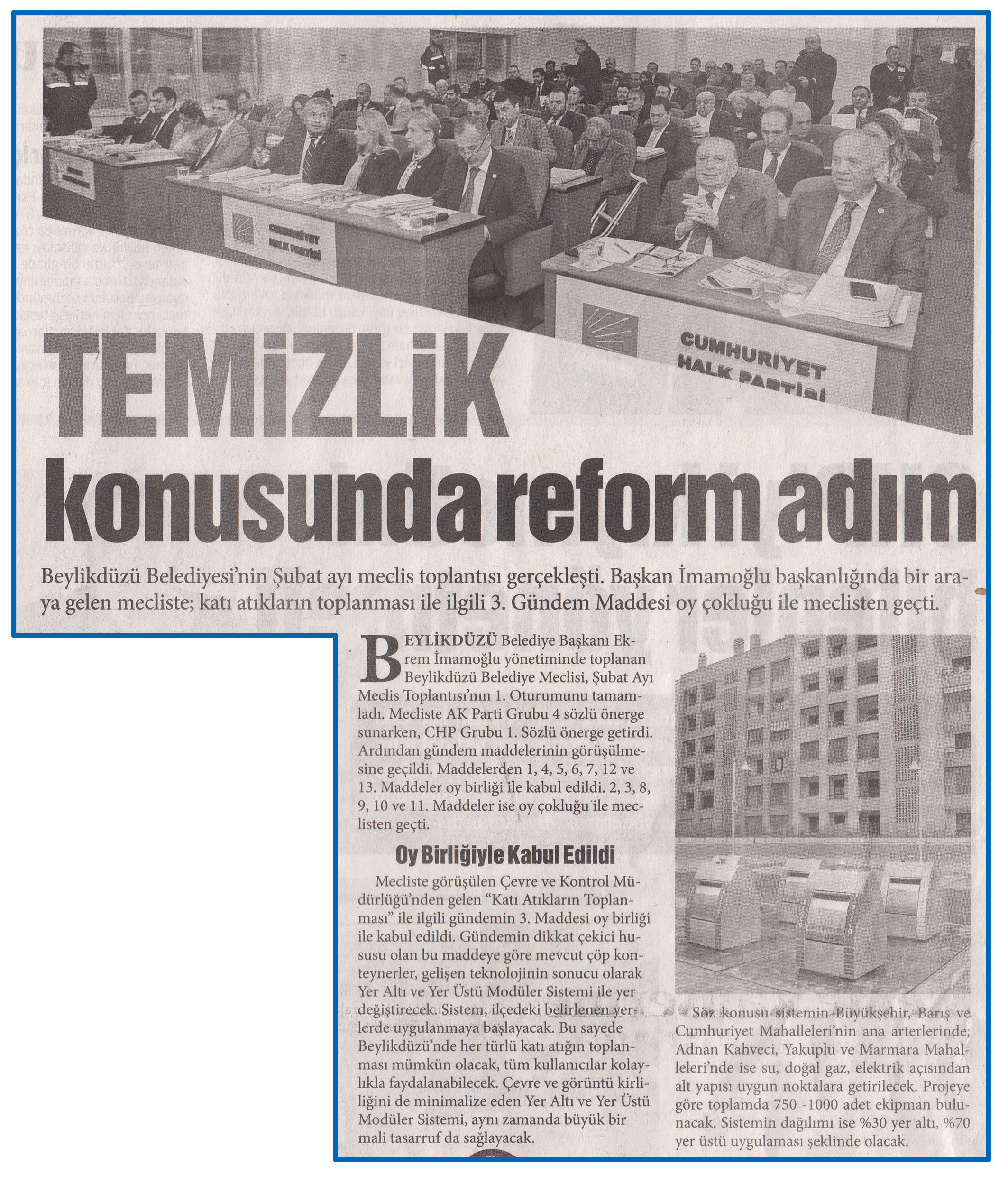 17 Şubat 2015 tarihli ''ANAHTAR'' gazetesi. Beylikdüzü Belediyesi'nin Şubat ayı meclis toplantısı gerçekleşti. Başkan İmamoğlu başkanlığında bir araya gelen mecliste,katı atıkların toplanması ile ilgili 3 Gündem Maddesi oy çokluğu ile meclisten geçti.