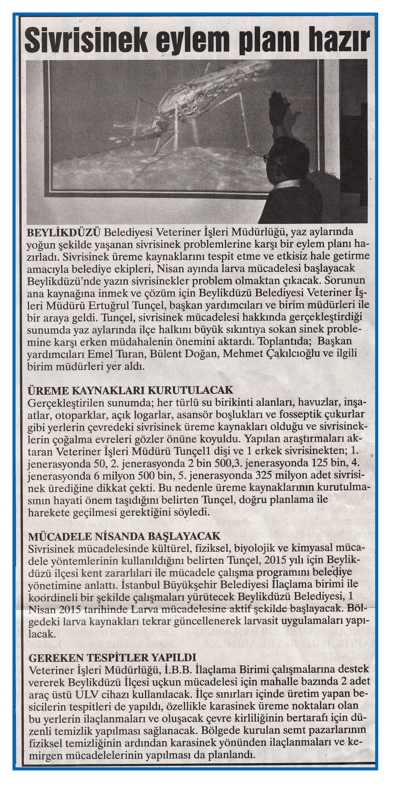 17 Şubat 2015 tarihli ''ANAHTAR'' gazetesi. Beylikdüzü Belediyesi Veteriner İşleri Müdürlüğü,yaz aylarında yoğun şekilde yaşanan sivrisinek problemlerine karşı bi eylem planı hazırladı.Sivrisinek üreme kaynaklarını tespit etme ve etkisiz hale getirme amacıyla belediye ekipleri,Nisan ayında larva mücadelesi başlatacak.