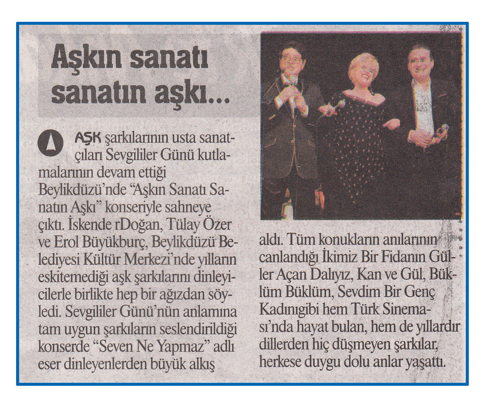 17 Şubat 2015 tarihli ''GAZETE İSTANBUL'' gazetesi. Aşk şarkılarının usta sanatçıları Sevgililer Günü kutlamalarının devam ettiği Beylikdüzü'nde ''Aşkın Sanatı Sanatın Aşkı'' konseriyle sahneye çıktı.