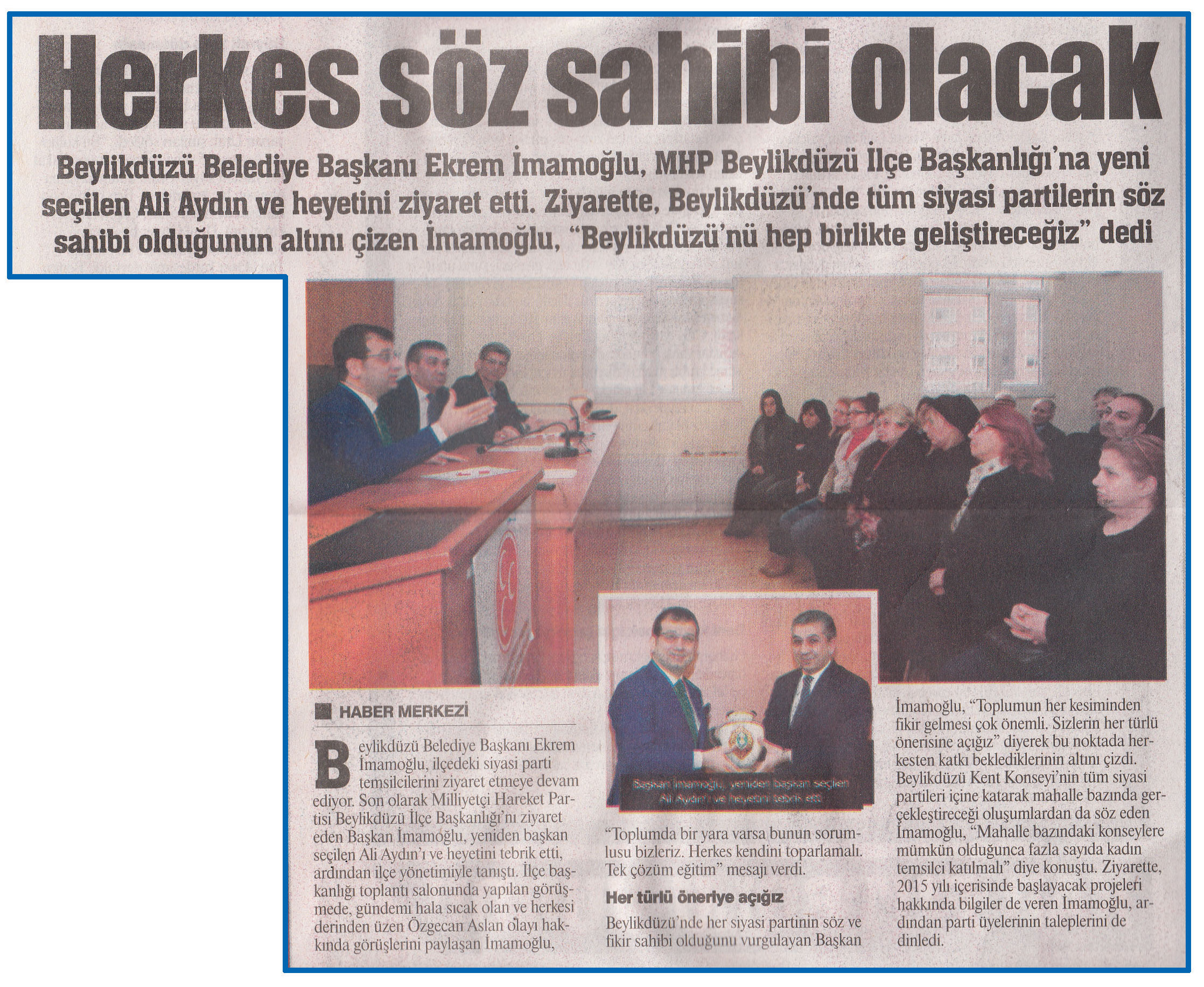 19 Şubat 2015 tarihli ''GAZETE İSTANBUL'' gazetesi. Beylikdüzü Belediye Başkanı Ekrem İmamoğlu,MHP Beylikdüzü İlçe Başkanlığı'na yeni seçilen Ali Aydın ve heyetini ziyaret etti.Ziyarette,Beylikdüzü'nde tüm siyasi partilerin söz sahibi olduğunun altını çizen İmamoğlu,''Beylikdüzü'nü hep birlikte geliştireceğiz''dedi.