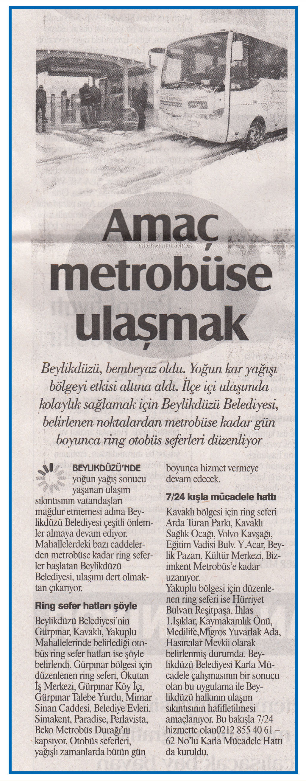 19 Şubat 2015 tarihli ''GAZETE İSTANBUL'' gazetesi. Beylikdüzü,bembeyaz oldu. Yoğun kar yağışı gölgeyi etkisi altına aldı. İlçe içi ulaşımda kolaylık sağlamak için Beylikdüzü Belediyesi,belirlenen noktalardan metrobüse kadar gün boyunca ring otobüs seferleri düzenliyor.