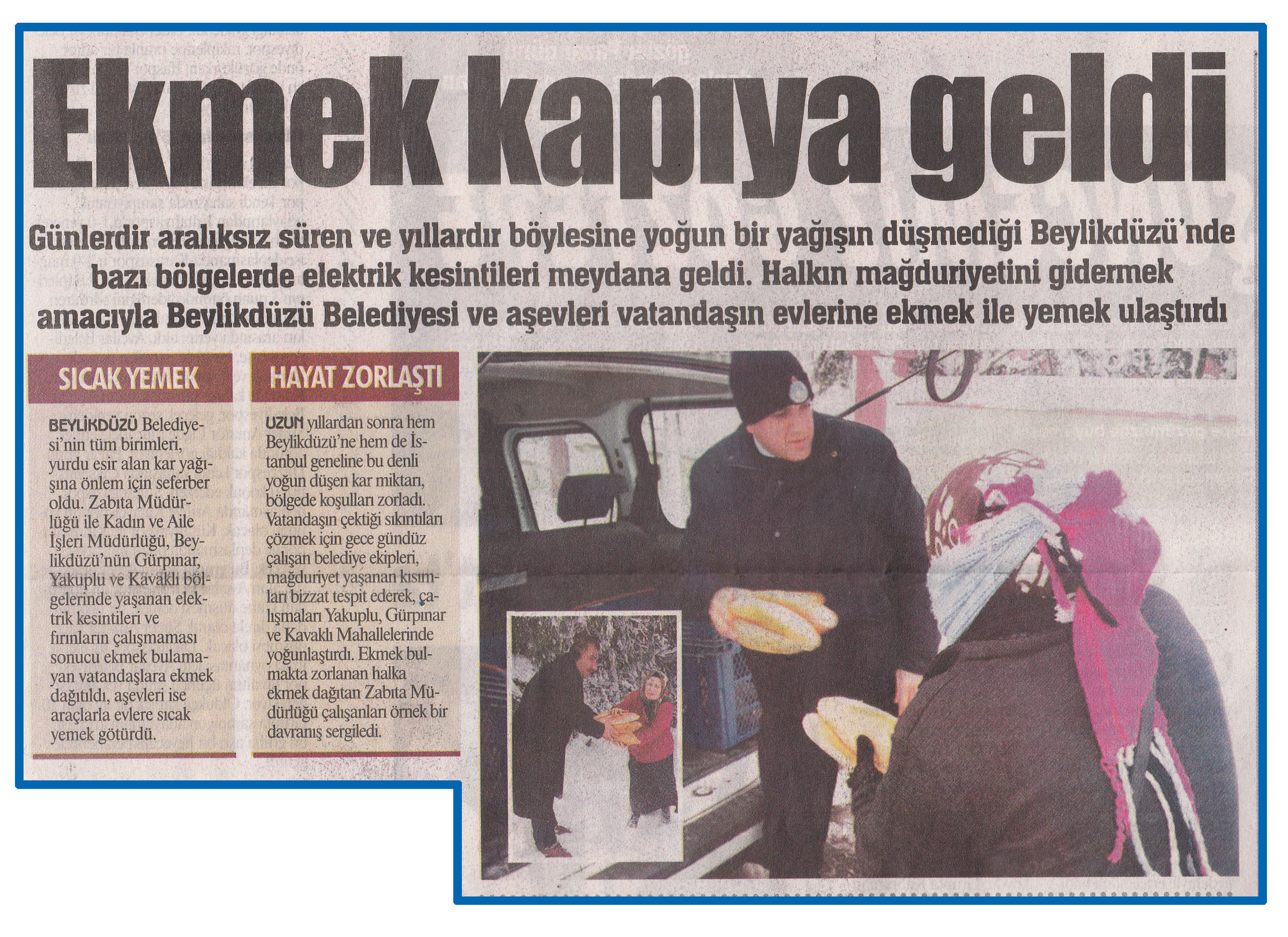 20 Şubat 2015 tarihli ''GAZETE İSTANBUL'' gazetesi. Günlerdir aralıksız süren ve yıllardır böylesine yoğun bir yağışın düşmediği Beylikdüzü'nde bazı bölgelerde elektrik kesintileri meydana geldi.Halkın mağduriyetini gidermek amacıyla Beylikdüzü Belediyesi ve aşevleri vatandaşın evlerine ekmek ile yemek ulaştırdı.