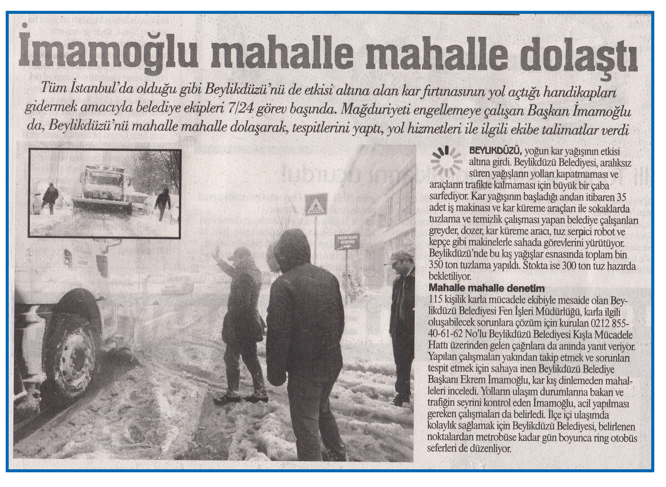 20 Şubat 2015 tarihli ''GAZETE İSTANBUL'' gazetesi. Tüm İstanbul'da olduğu gibi Beylikdüzü'nü de etkisi altına alan kar fırtınasının yol açtığı handikapları gidermek amacıyla belediye ekipleri 7/24 görev başında. Mağduriyeti engellemeye çalışan Başkan İmamoğlu da,Beylikdüzü'nü mahalle mahalle dolaşarak,tespitlerini yaptı,yol hizmetleri ile ilgili ekibe talimatlar verdi.