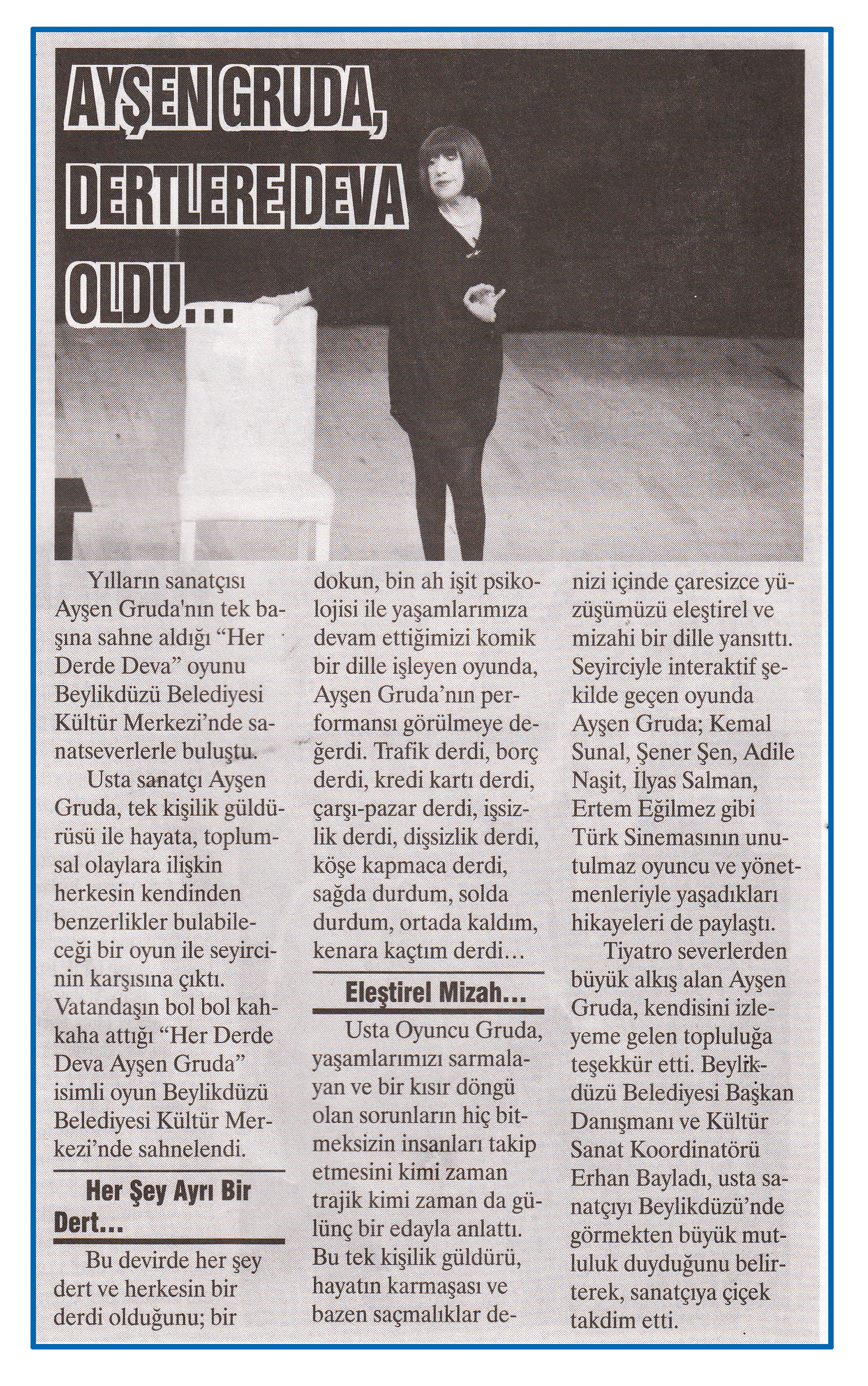 23 Şubat 2015 tarihli ''HABER EKSPRESS'' gazetesi.Yılların sanatçısı Ayşen Gruda'nın tek başına sahne aldığı ''Her Derde Deva'' oyunu Beylikdüzü Belediyesi Kültür Merkezi'nde sanatseverlerle buluştu.