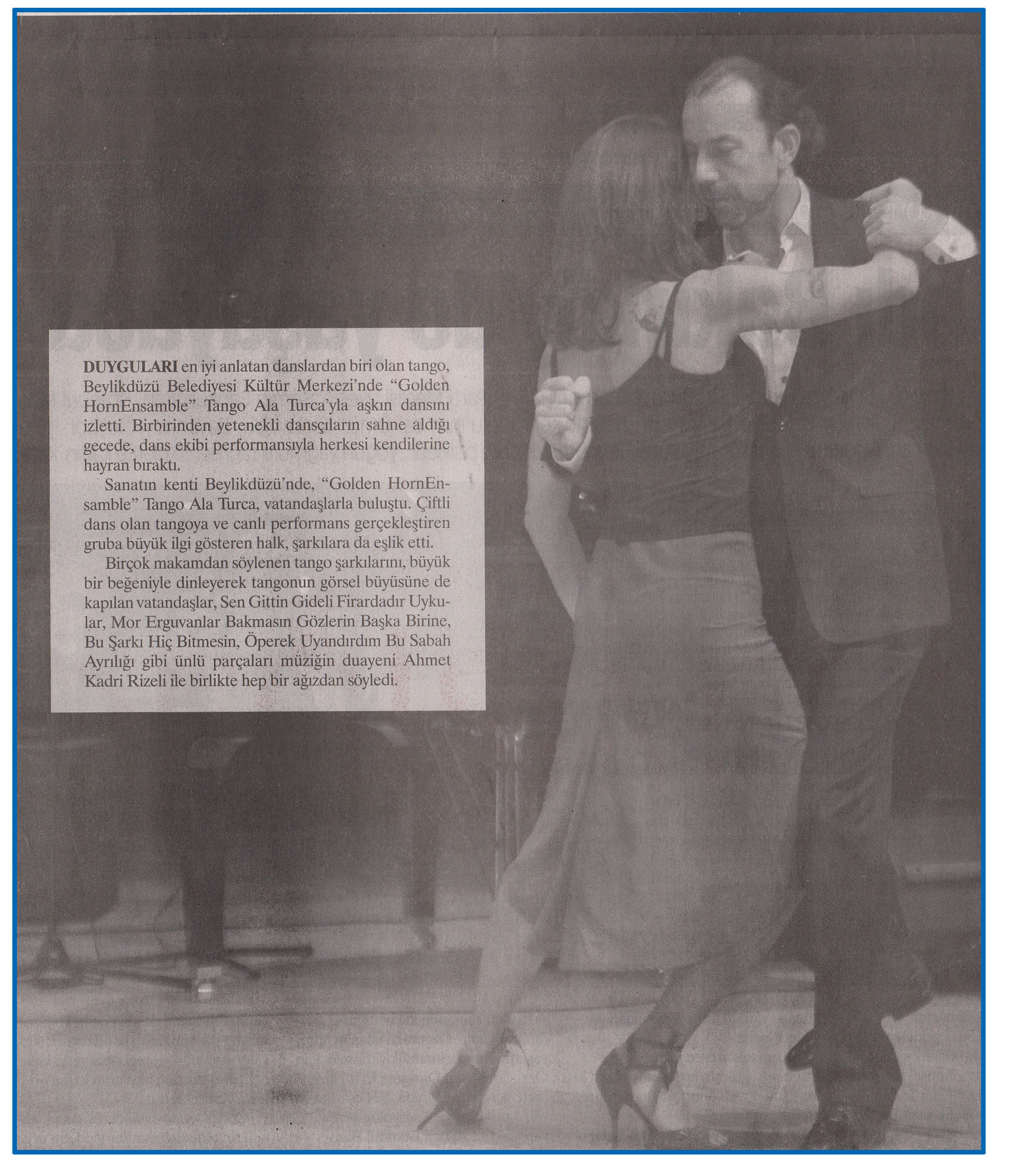 23 Şubat 2015 tarihli ''DEĞİŞİM'' gazetesi. Duyguları en iyi anlatan danslardan biri olan tango,Beylikdüzü Belediyesi Kültür Merkezi'nde ''Golden HornEnsamble'' Tango Ala Turca'yla aşkın dansını izletti. Birbirinden yetenekli dansçıların sahne aldığı gecede,dans ekibi performansıyla herkesi kendilerine hayran bıraktı.