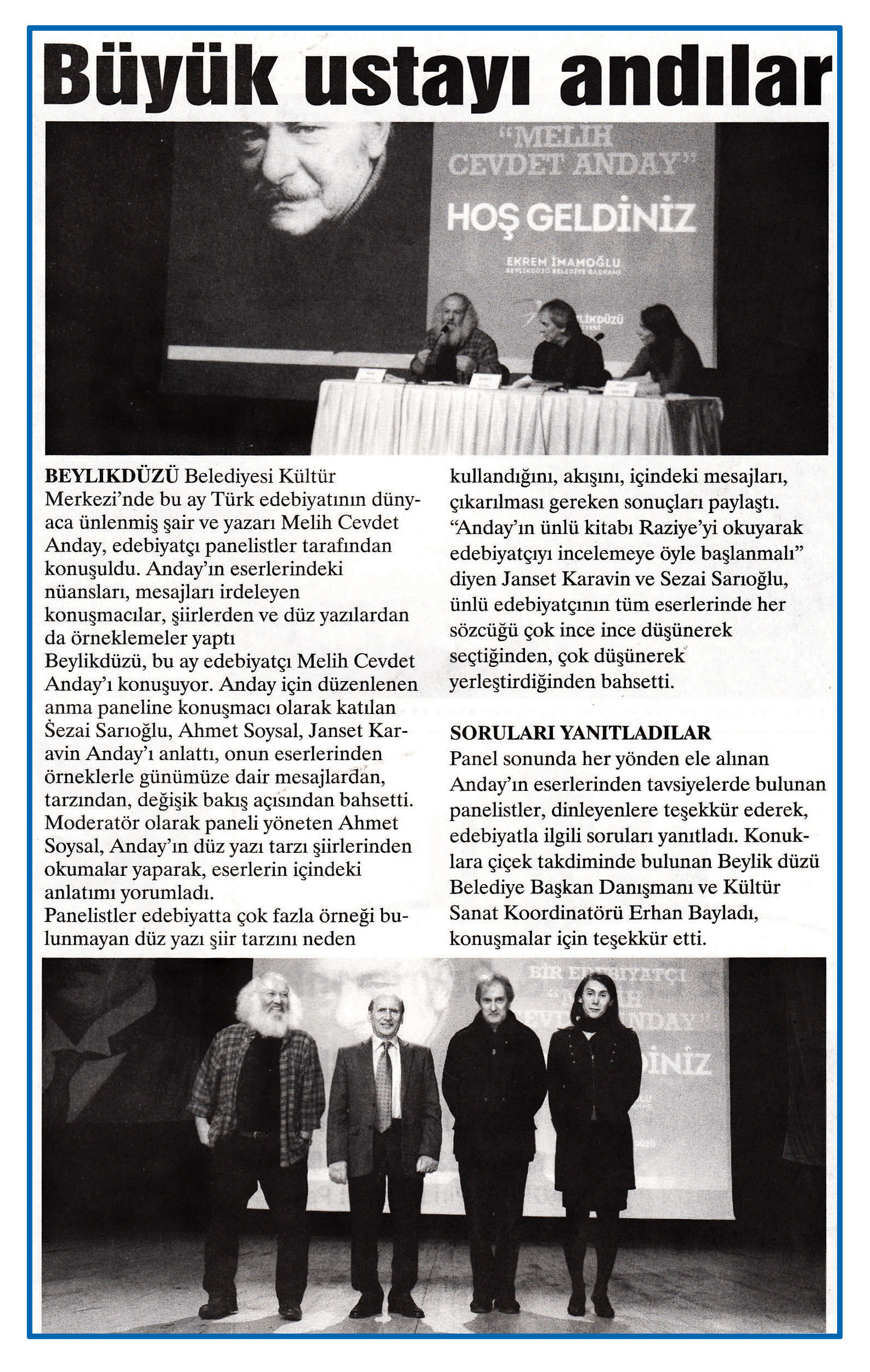 26 Şubat 2015 tarihli ''YENİ GÜN'' gazetesi.Beylikdüzü Belediyesi Kültür Merkezi'nde bu ay Türk edebiyatının dünyaca ünlenmiş şair ve yazarı Melih Cevdet Anday,edebiyatçı panelistler tarafından konuşuldu.Anday'ın eserlerindeki nüansları,mesajları irdeleyen konuşmacılar,şiirlerden ve düz yazılardan da örnekleme yaptı.