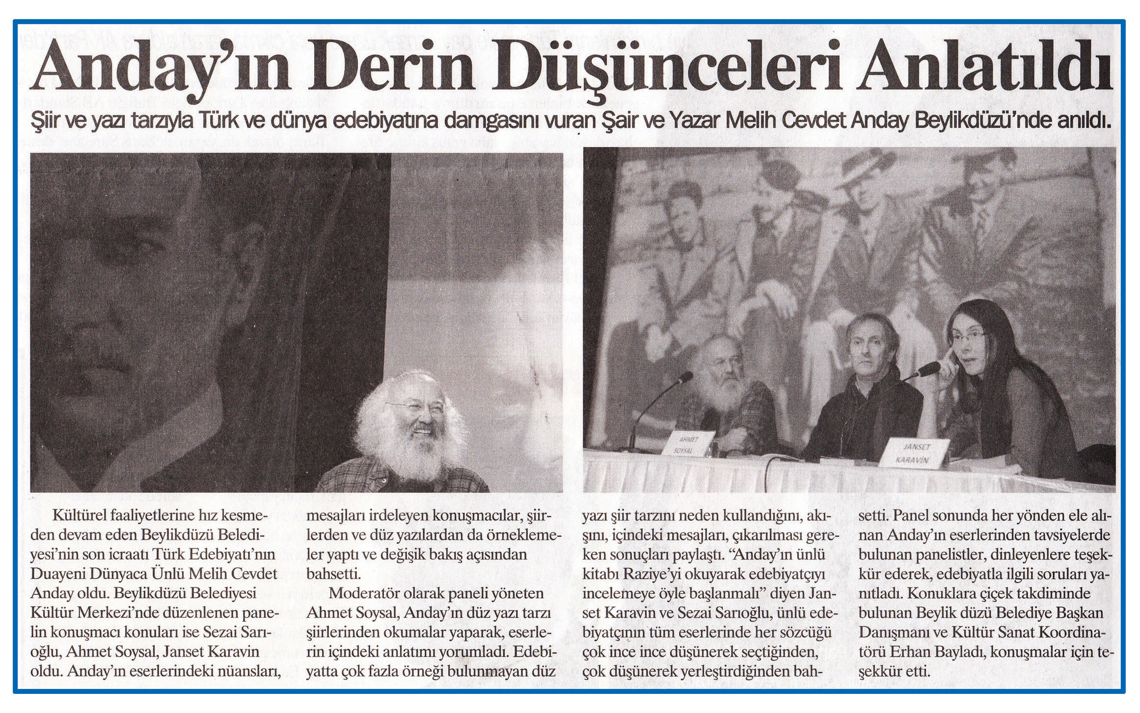 27 Şubat 2015 tarihli ''KENT GÜNDEM'' gazetesi. Şiir ve yazı tarzıyla Türk ve dünya edebiyatına damgasını vuran Şair ve Yazar Melih Cevdet Anday Beylikdüzü'nde anıldı.